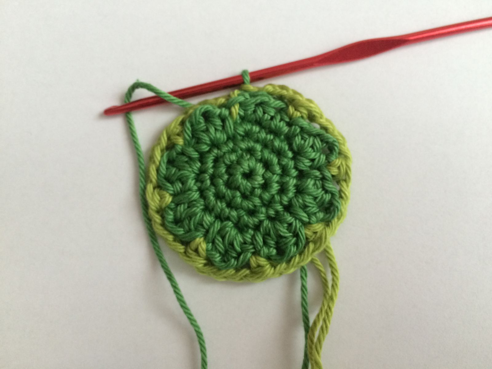Der untere Teil vom Panzer wird in gelb und dunkelgrün mit der Häkelnadel 2,5 mm gehäkelt.