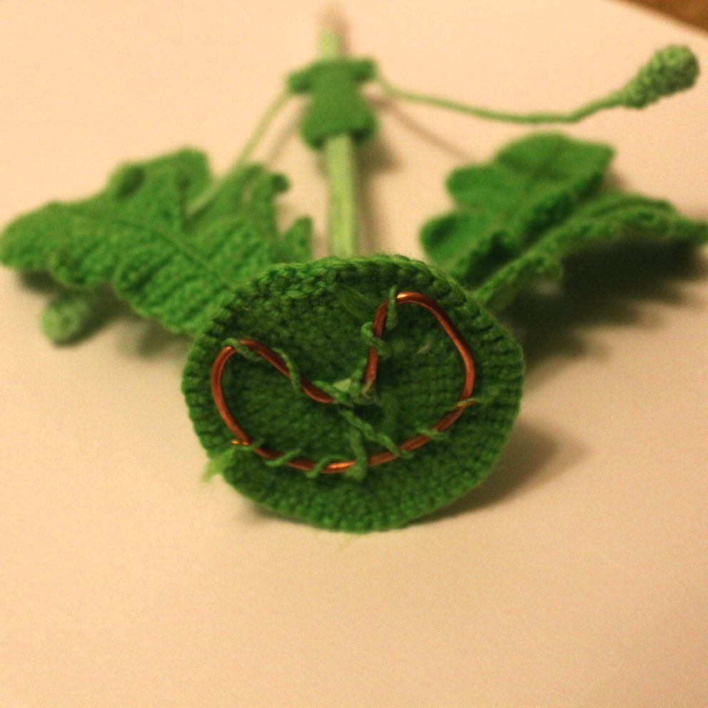 Prepare 4 pieces of thin wire, each about 1.5 times the length of a leaf. Lightly grease the wire with glue and wrap it with the same yarn. Let dry. Then apply a wire to the middle of the leaf, departing from the upper tip of 1 cm, and sew with a thread or split yarn. Stitches are laid in the same direction as the winding. Hide or glue all the tips of the threads.