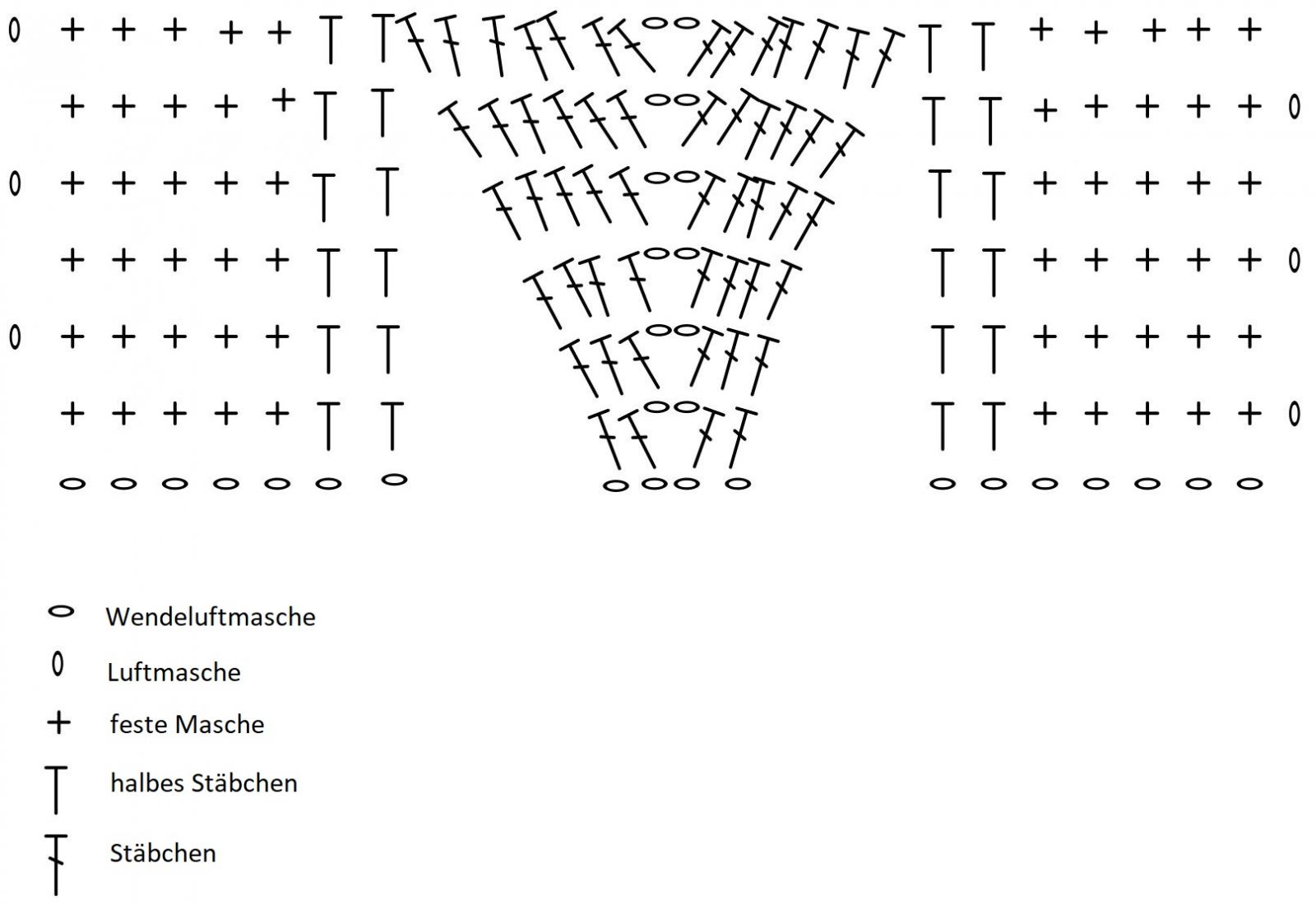 6. Reihe: 1 Wlfm, 5 fM, 2 hStb, 7 Stb, 2 Lfm, 7 Stb, 2 hStb, 5 fM, dabei nur ins vordere