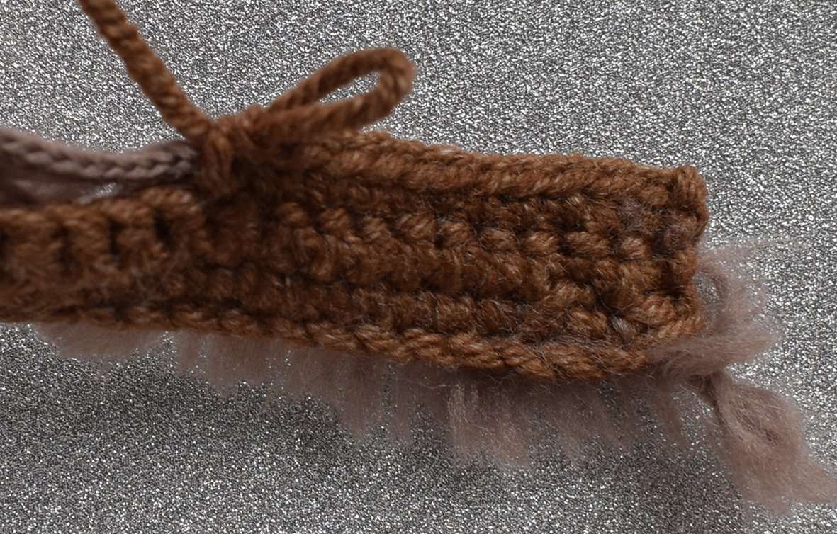 Flauschwolle legen wir, während wir Häkeln, parallel zur Linie der Seite und umwickeln gleichzeitig den Faden von Flauschwolle mit Baumwollgarn.