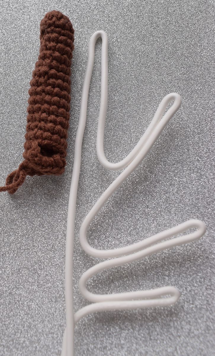 Führen Sie einen Teil des Skeletts der fertigen Hörner durch den Basisteil. Nach 7 - 8 cm bringen wir den Draht vom Basisteil nach oben für den zweiten Teil des Skeletts. Wir machen das Skelett des zweiten Teils der Hörner. Führen Sie das Ende des Drahtes in das Basisteil ein. Siehe das Foto.