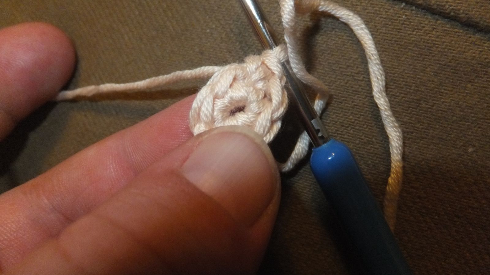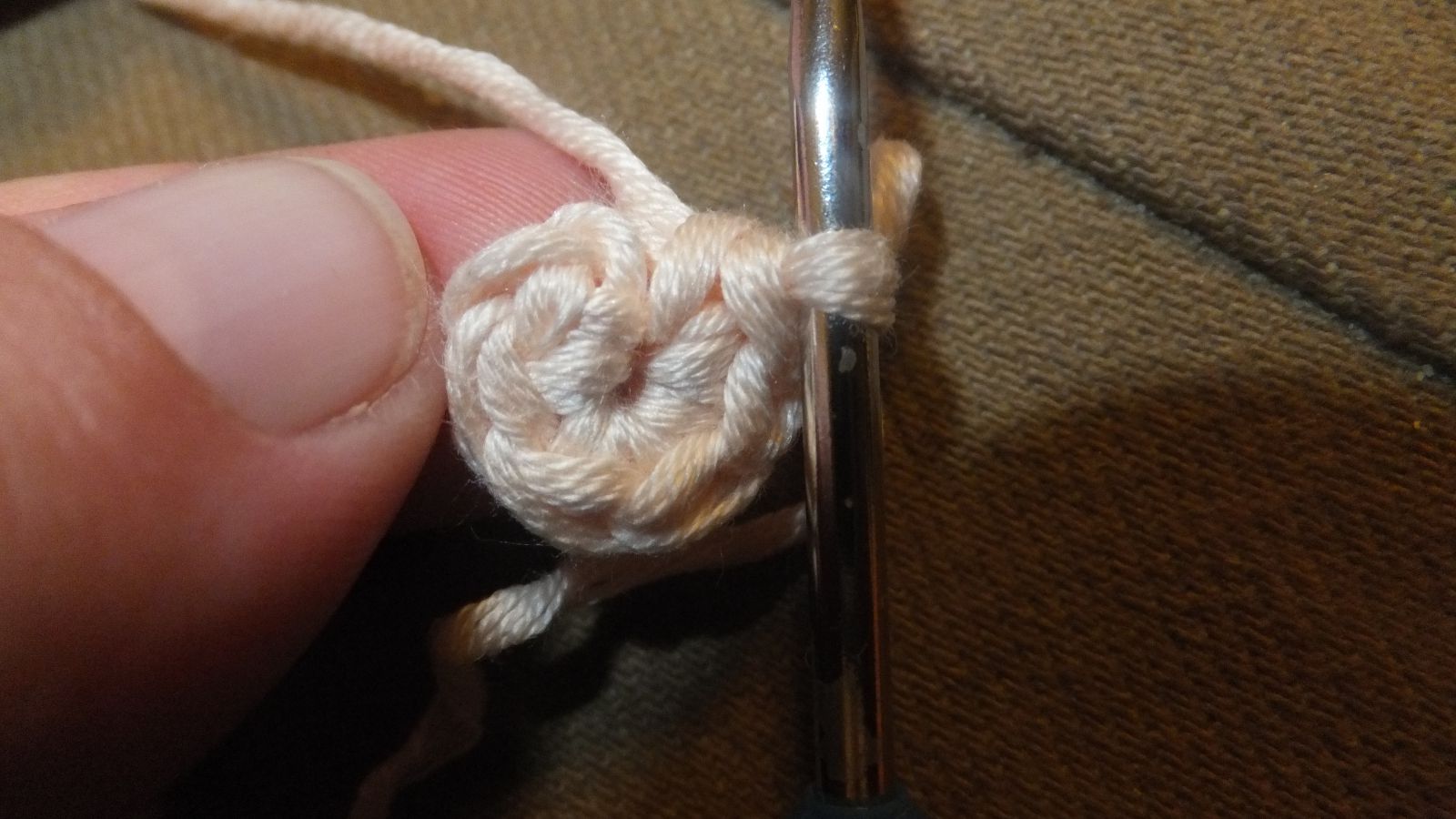 und 1 Kettmasche in die 1. FM häkeln (bei normalem Rundenhäkeln)
