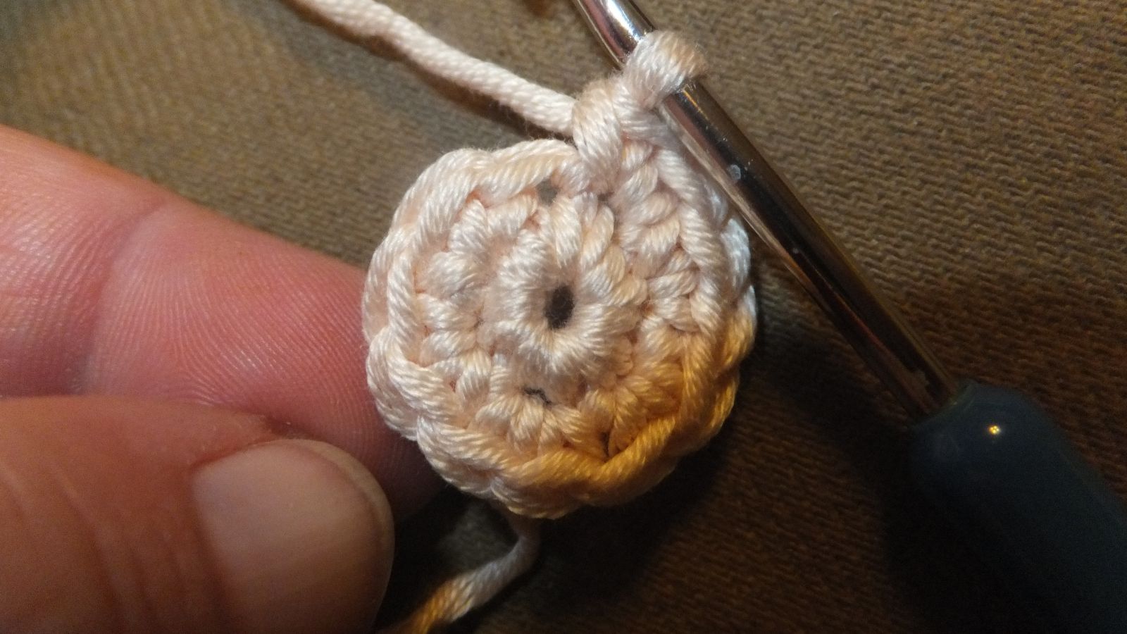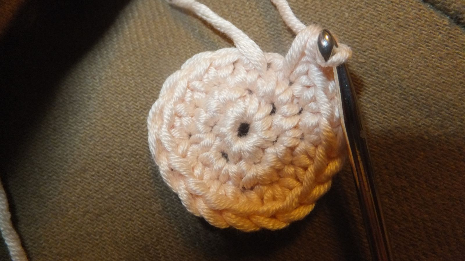 Also die nächsten Runden häkel ich 30 FM, und am Rundenende 1 KM + 1 HLM