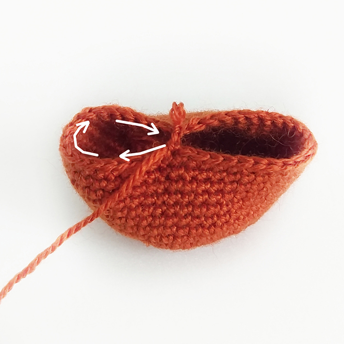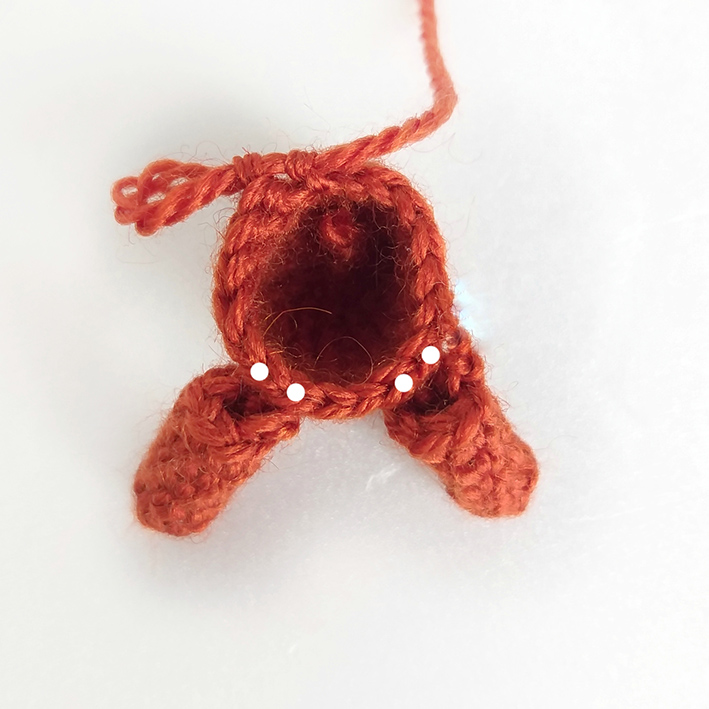 9. 6 sc, work into loops of the left leg 4 sc, 2 inc, work into loops of the right leg 4 sc, 6 sc = 24