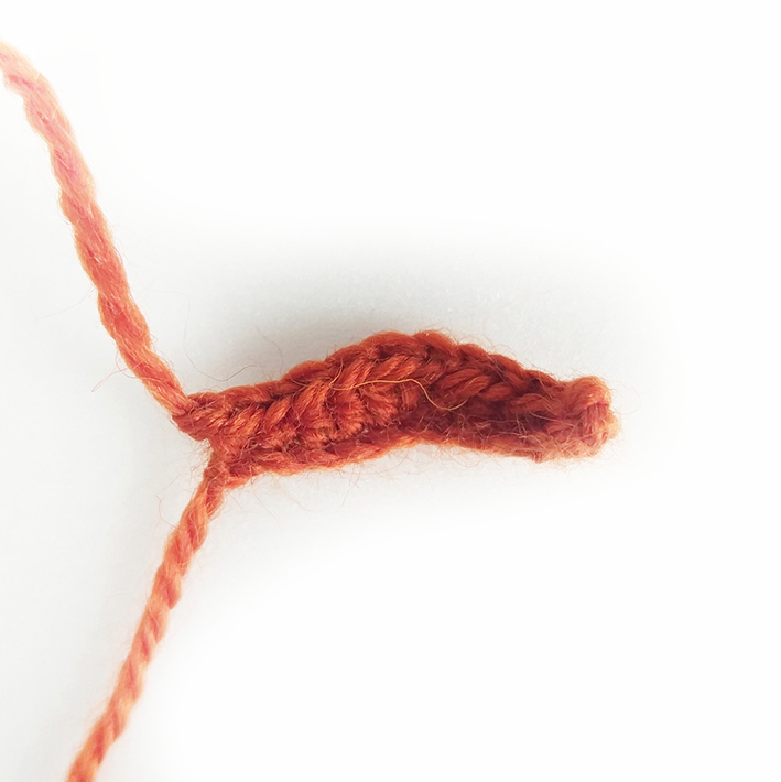 6. Add some hollow fiber. Fold the part in two, work 3 sc by hooking through both edges of the part.