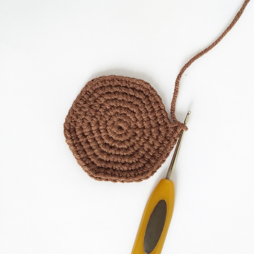 10. 2 Fm durch die Maschen des 2. und 3. Teils gleichzeitig häkeln, weiter in einem großen Kreis häkeln: 8 Fm = 8