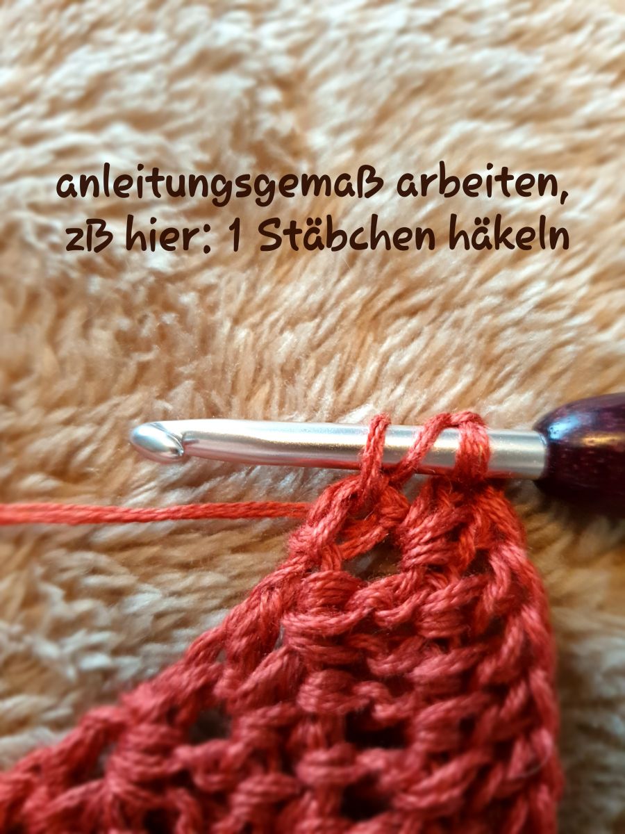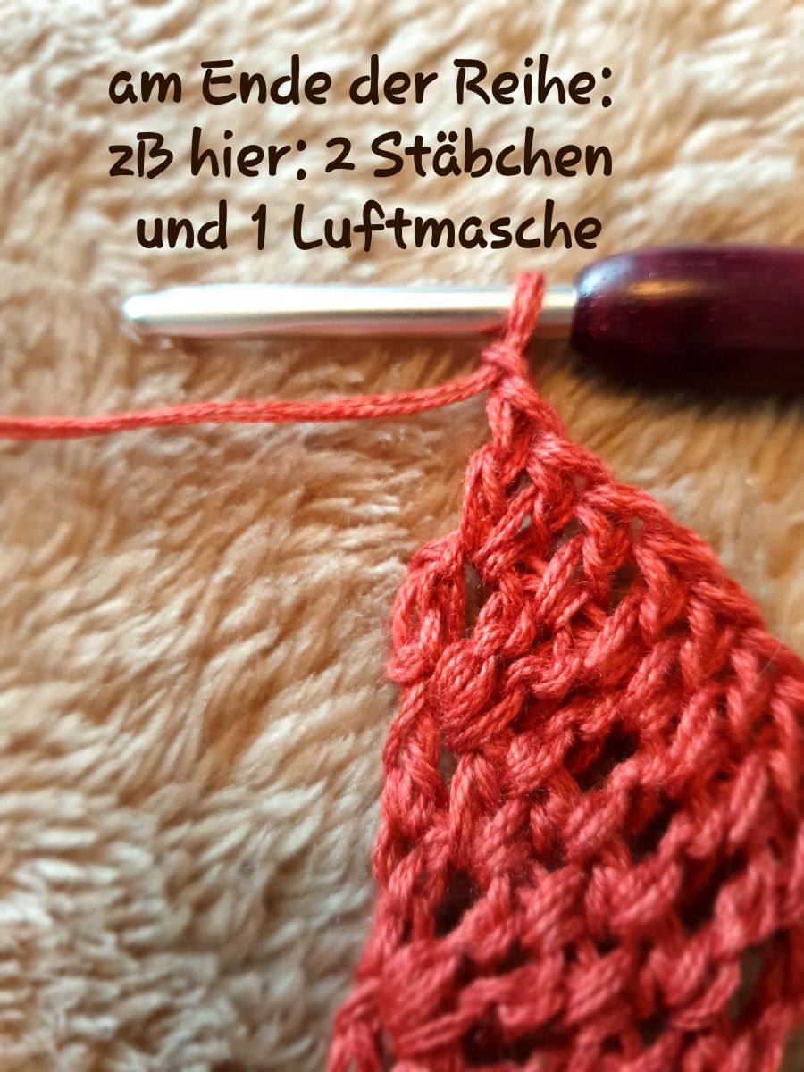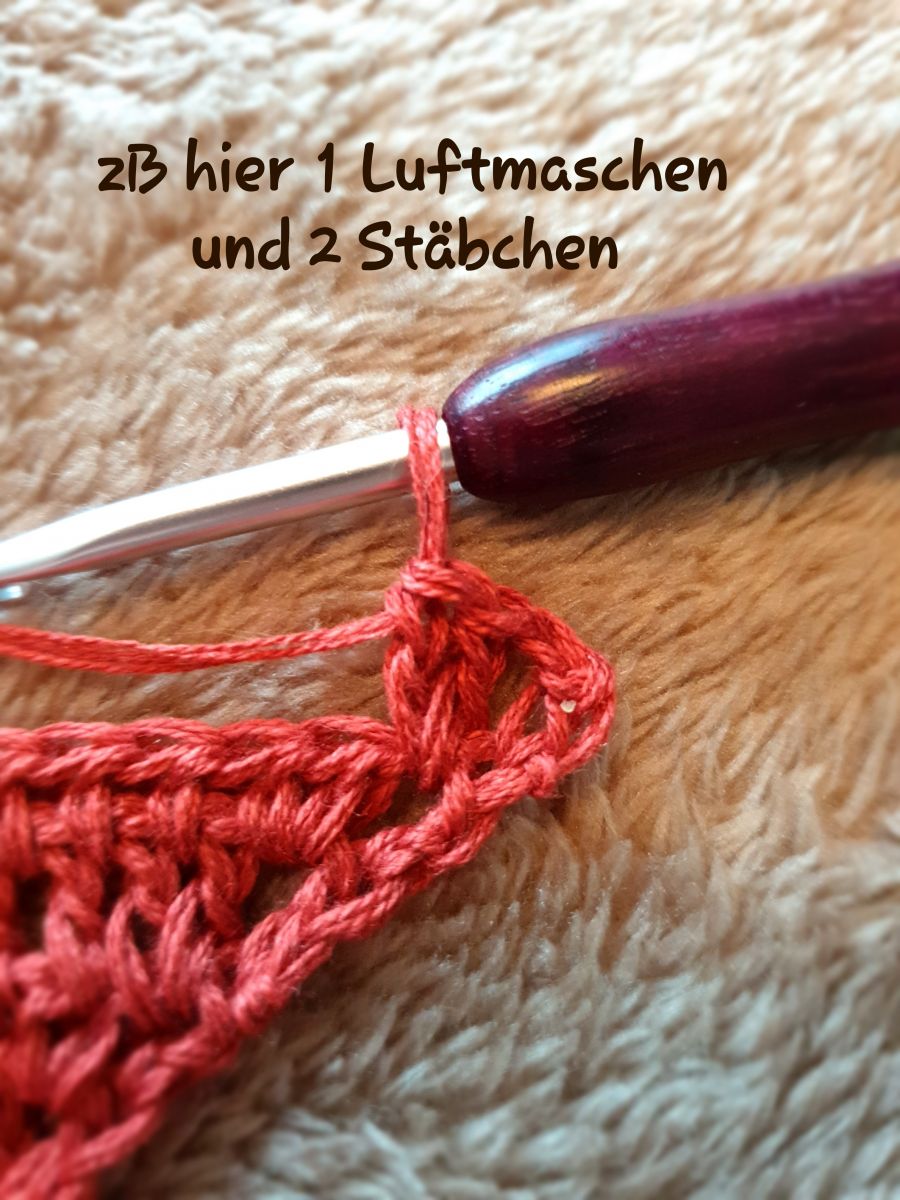 Nun noch zu den Alternativen, denn Deine Anleitung kann andere Angaben haben als dieses Beispiel. Hier wurde erklärt, wie 3 Steigeluftmaschen ersetzt werden, was der Arbeitshöhe von Stäbchen entspricht.