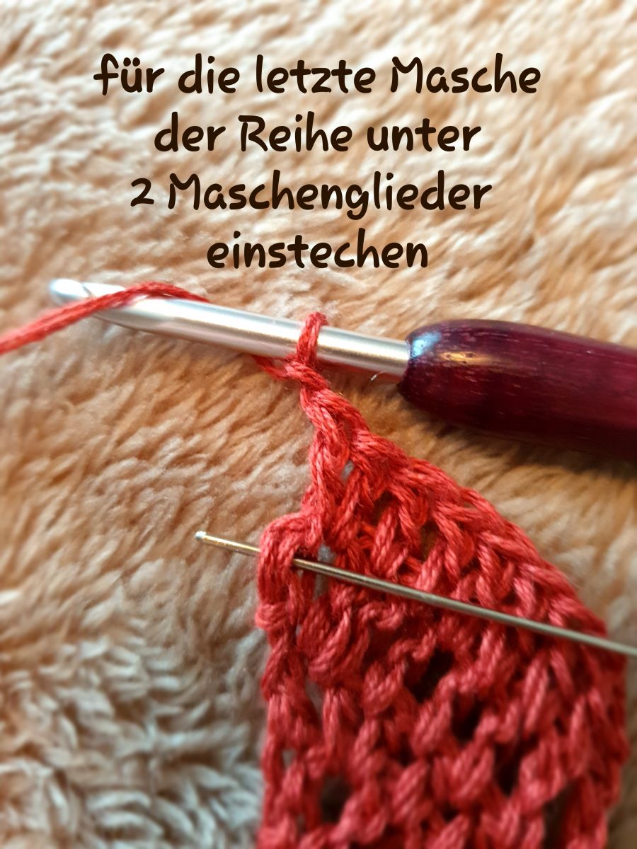 Am Ende der Reihe wird ja keine Masche ersetzt, sondern nur anders eingestochen. Deshalb häkelst Du die angegebene letzte Masche ganz normal, nur mit dem Unterschied, dass Du unter 2 Maschenglieder einstichst.