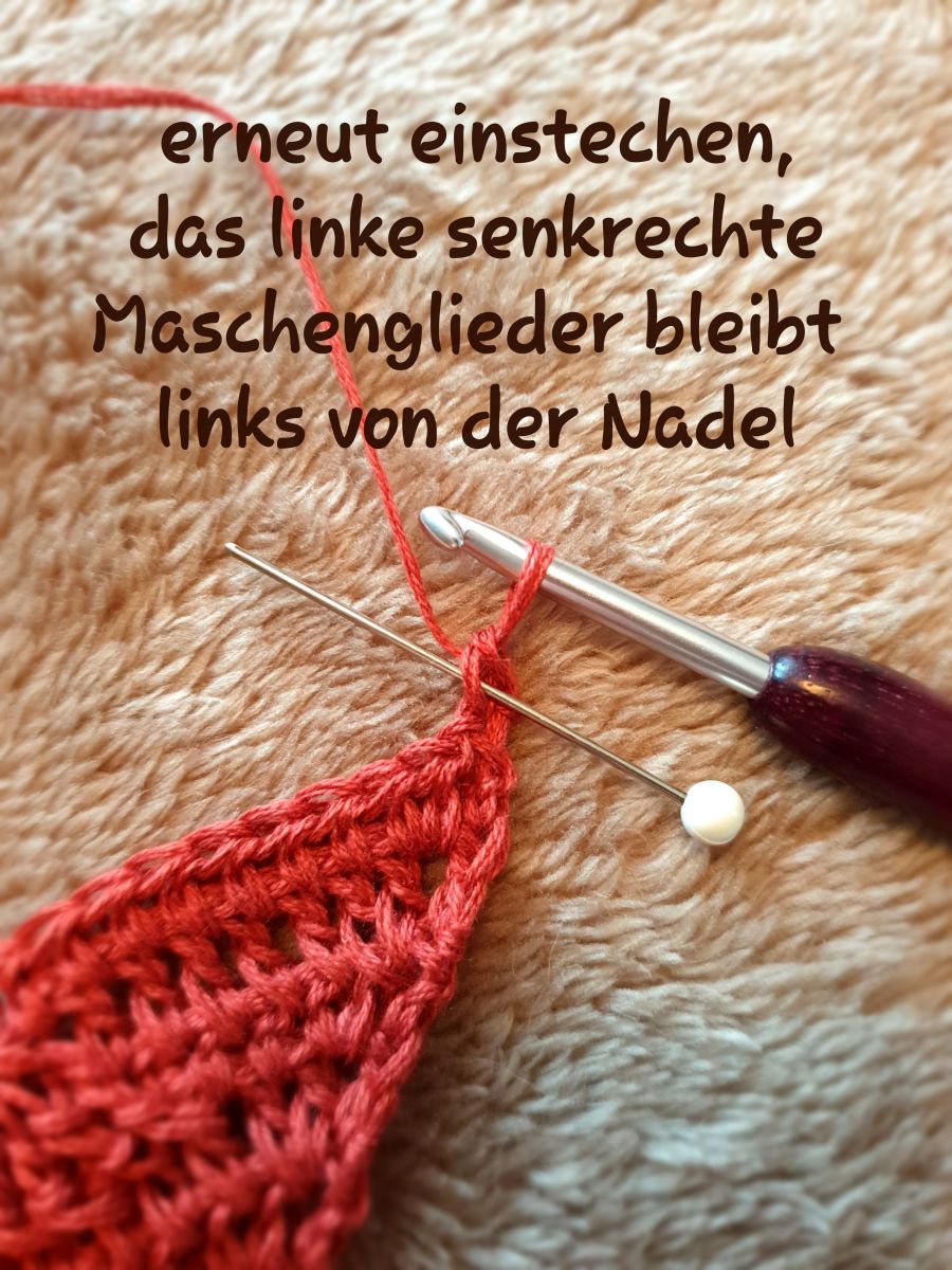 Aber die letzte Masche (hier: 1 St) wird nun wieder anders gearbeitet, als Du es gewohnt bist. Manche machen dieses Stäbchen ebenfalls um die Luftmaschen der Vorreihe oder in die 3. Steigeluftmasche. Aber für den geraden Rand wird nun unter 2 Maschenglieder der obersten fM des Reihenanfangs eingestochen. Die Stecknadel der folgenden Abbildung zeigt die Einstichstelle für dieses Stäbchen, das dann ganz normal abgemascht wird.