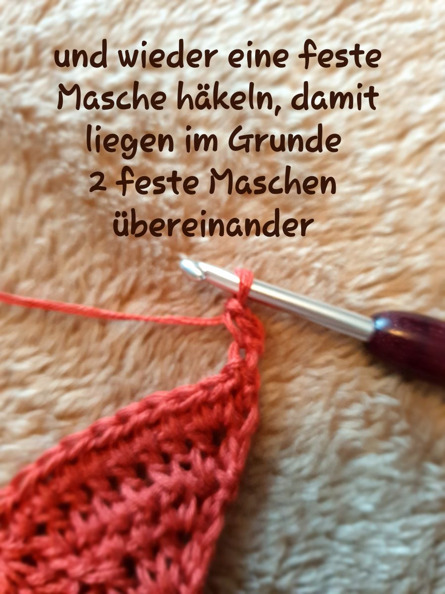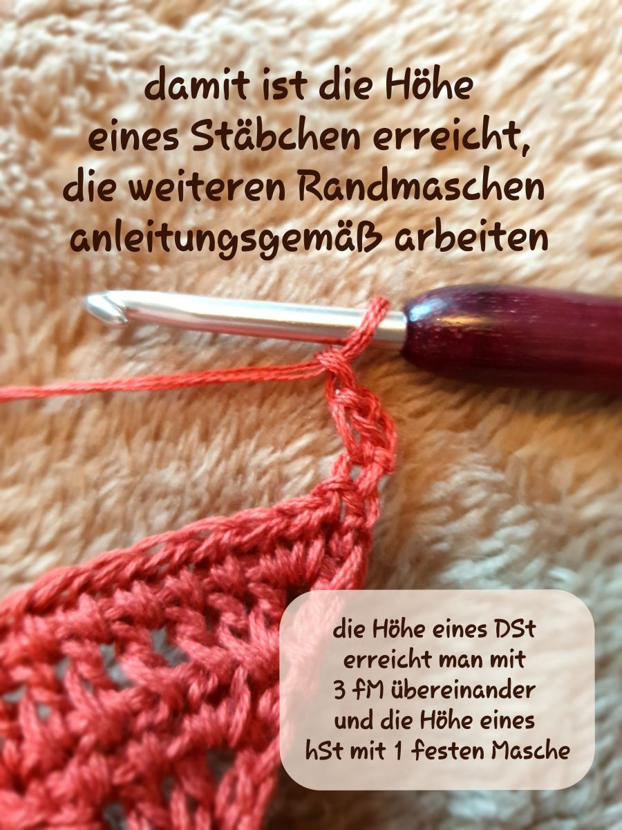 Nun arbeitest Du anleitungsgemäß weiter, im hiesigen Beispiel: 1 Lm (Du hast durch die beiden fM ja nur 3 StLm ersetzt) und die beiden Stäbchen des Randes.