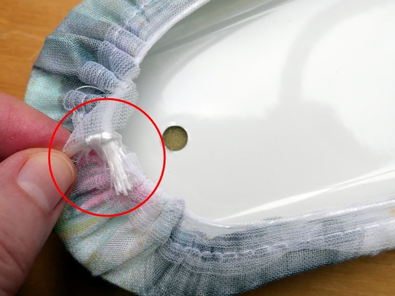Ich habe ein geschätztes Stück Gummiband abgeschnitten und mit einer Sicherheitsnadel versehen. Diese habe ich dann durch den genähten Tunnelzug geführt. Am Ende habe ich den Bezug nach Gefühl zusammengezogen und einen provisorischen Knoten gemacht.