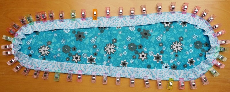 Es geht einmal rund herum mit dem Stoffklammern. Am Ende angekommen habe ich dann auch die andere doppelt gefaltete schmale Kante angeklammert. Beide schmalen Kanten liegen direkt nebeneinander.
