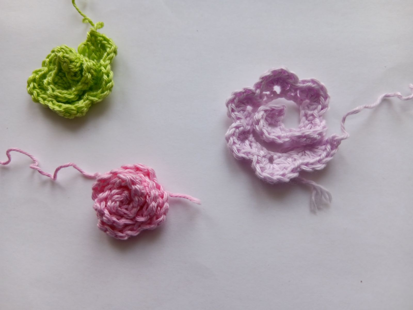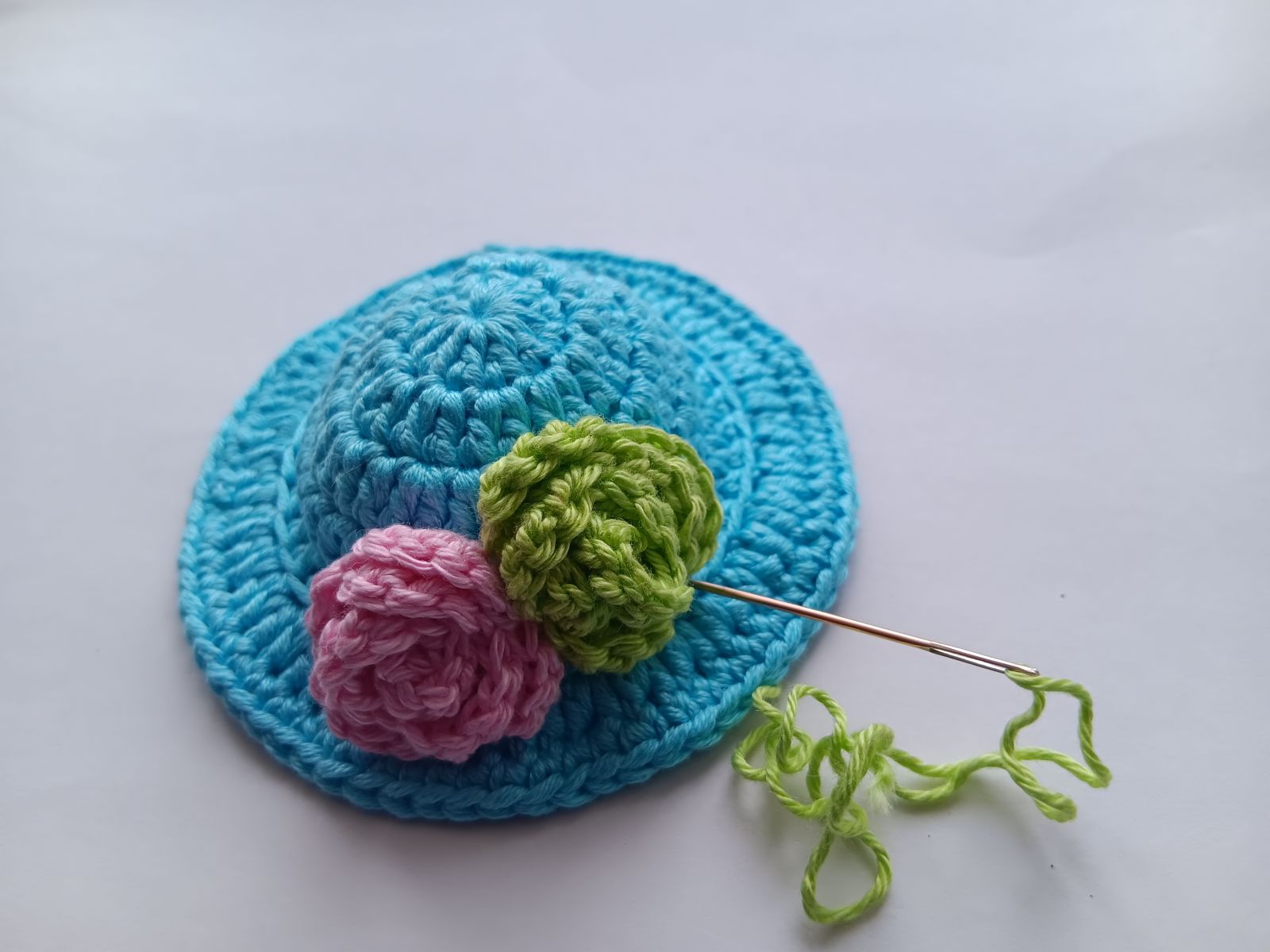 Rosen formen: das Teil zusammenrollen, durch Reihe 1 einige Male nähen, dabei alle Schichten des Teils durchstechen. Die Blumen an den Hut nähen. Faden vernähen und abschneiden.