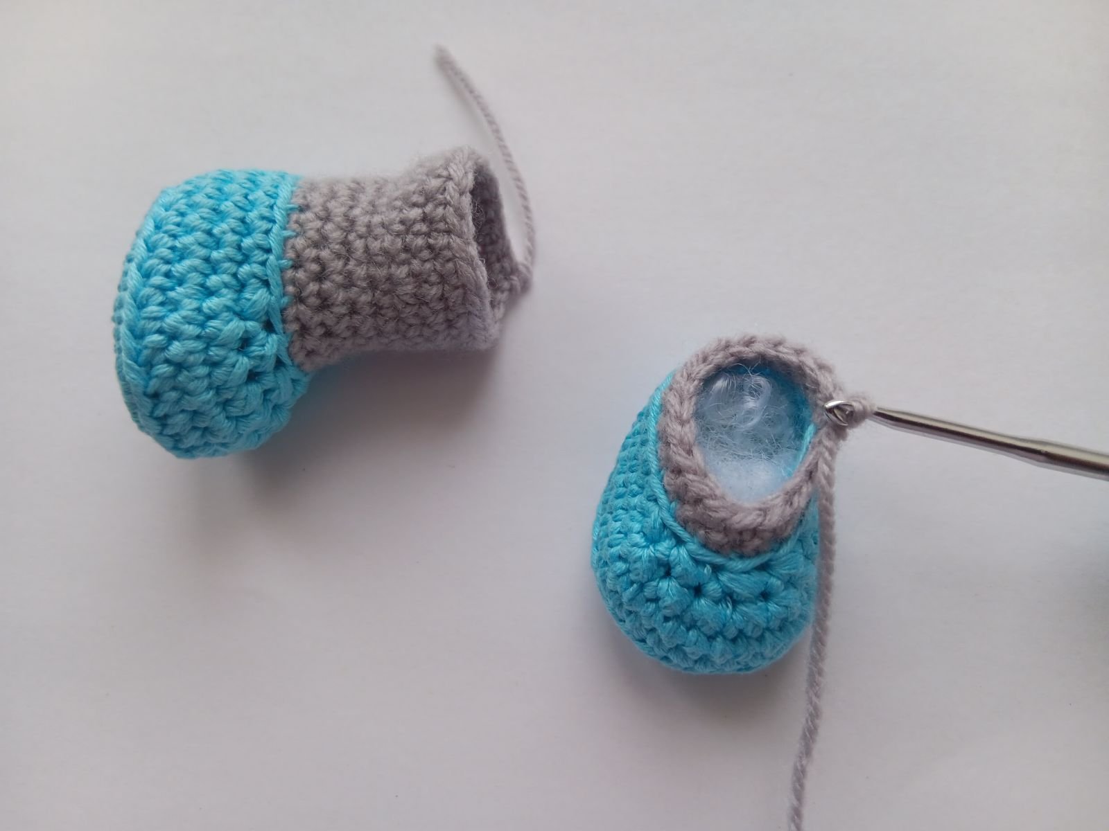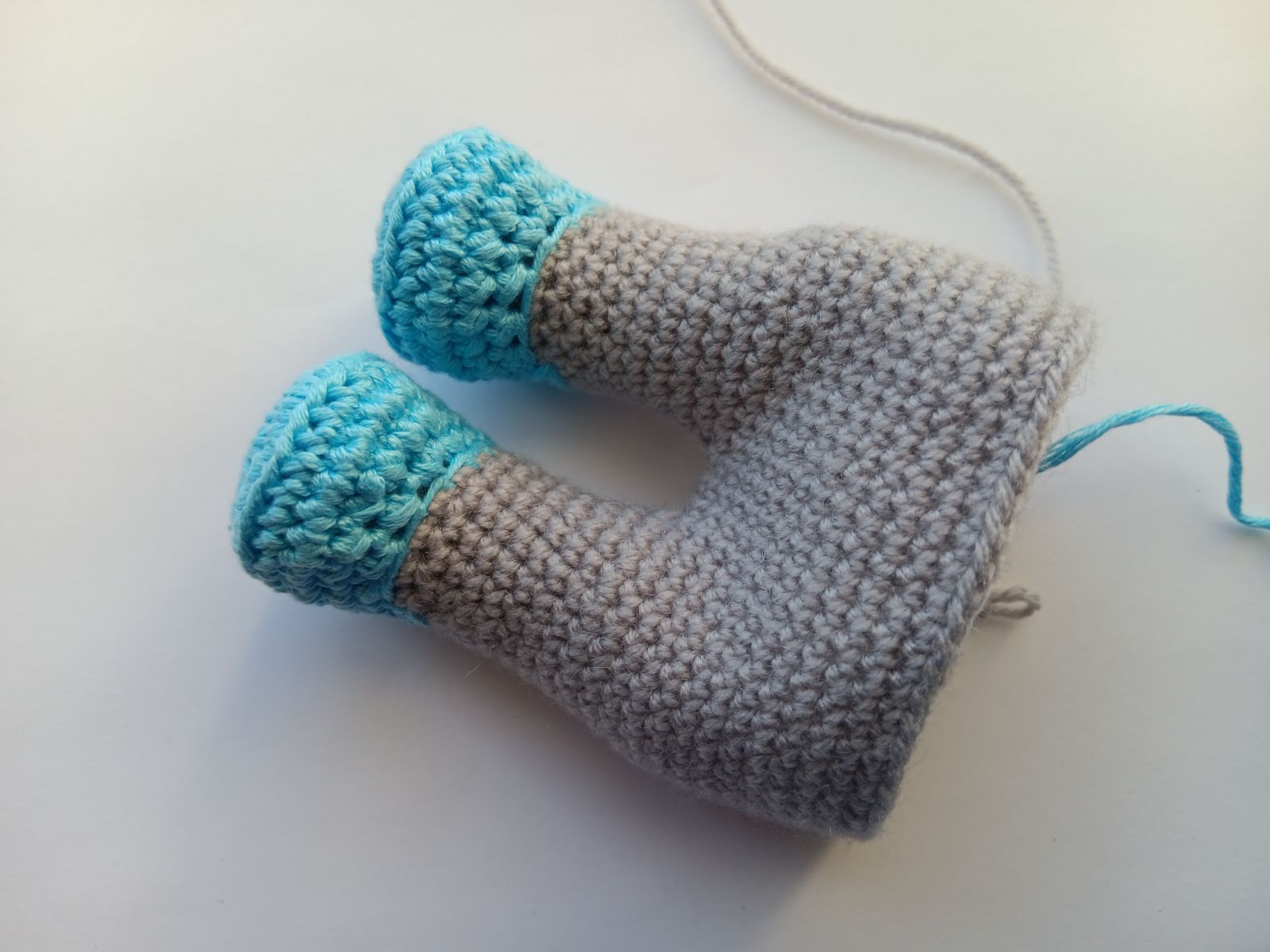 Runde 1: 3 Luftmaschen, den Bein neben dem nicht abgeketteten Bein legen und über beide Beine eine Runde häkeln (21 Maschen der ersten Bein, je 1 feste Masche in die nächsten 3 Luftmaschen, 21 Maschen der zweiten Bein)