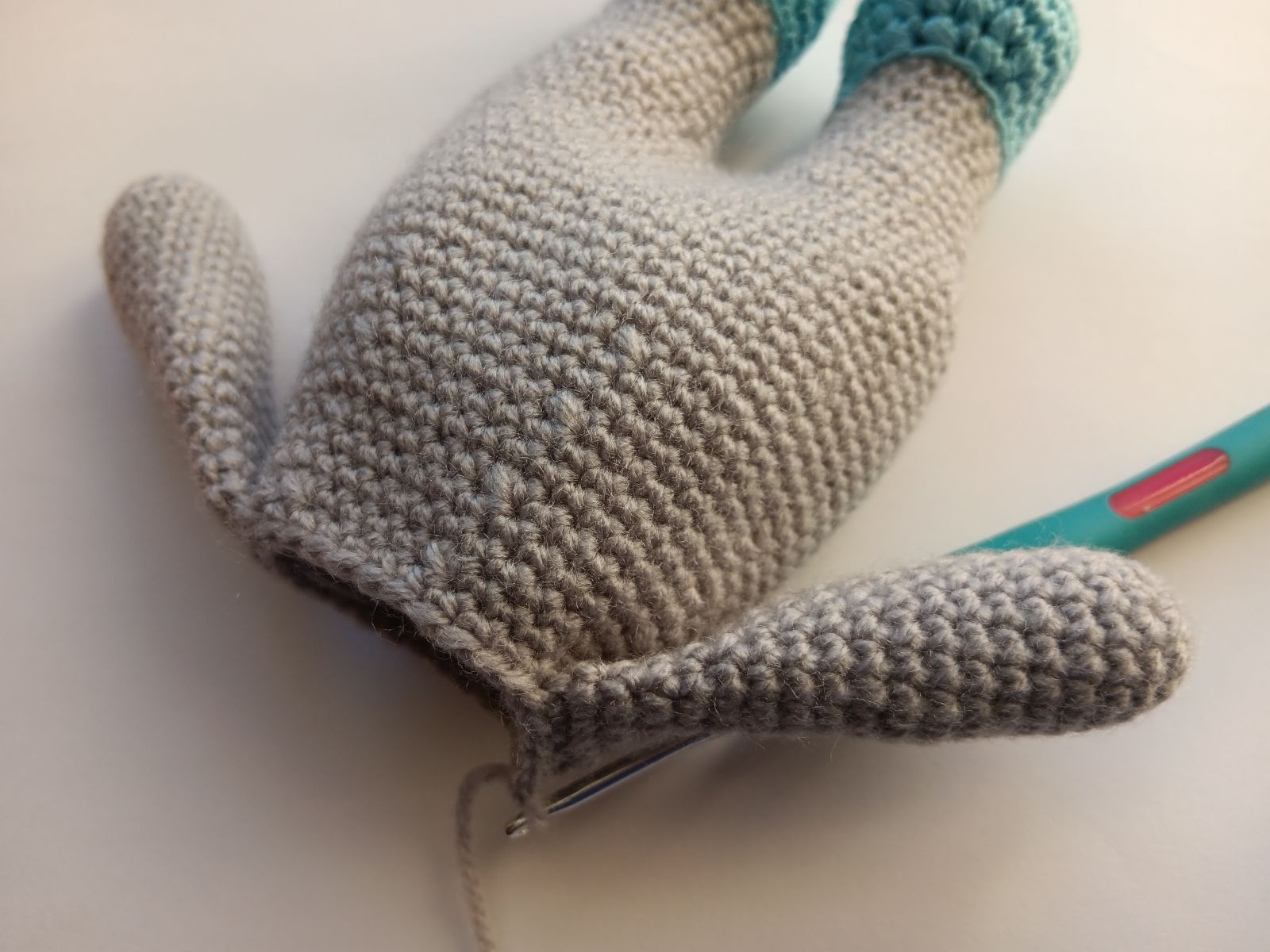 Runde 26: je 1 feste Masche in die nächsten 5 Maschen, 6 feste Maschen durch die Maschen des 1.Armes und des Körpers gleichzeitig, je 1 feste Masche in die nächsten 10 Maschen, 6 feste Maschen durch die Maschen des 2.Armes und des Körpers gleichzeitig, je 1 feste Masche in die nächsten 3 Maschen.