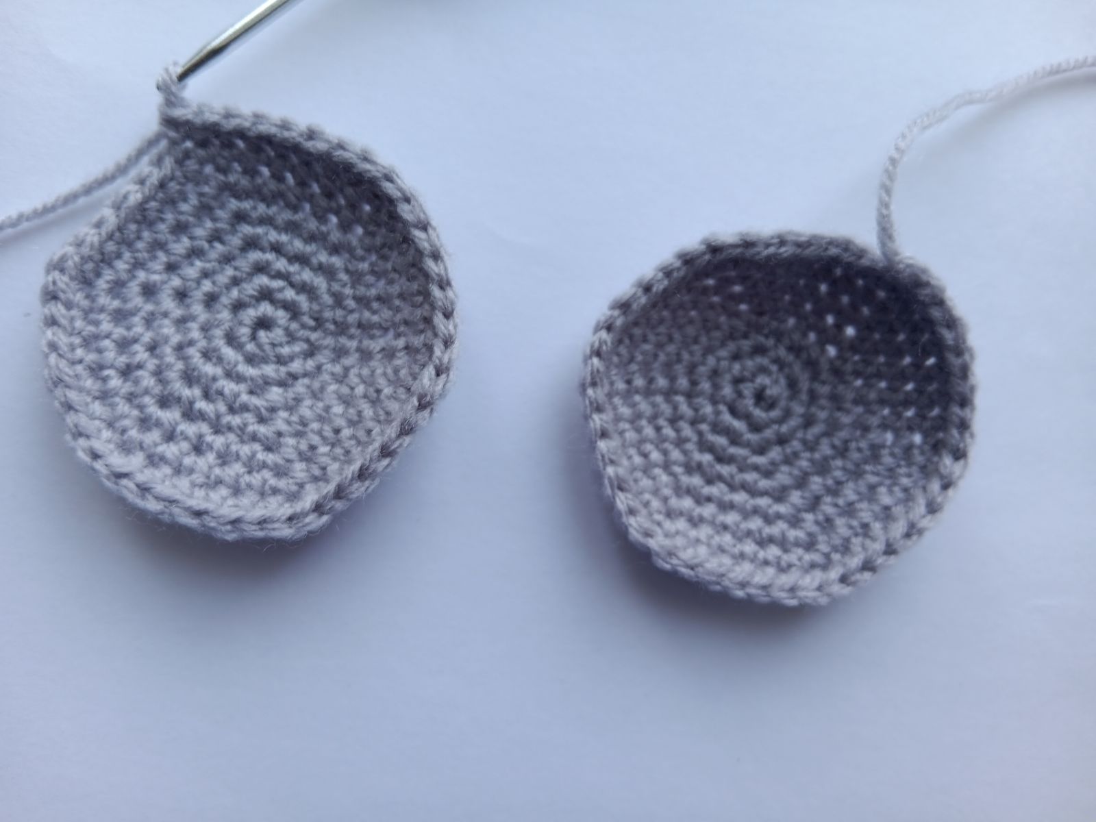 Zum Schluss fehlen noch die Ohren für die Maus. Jedes Ohr in Spiralrunden mit festen Maschen häkeln. Die Ohren werden nicht gefüllt.