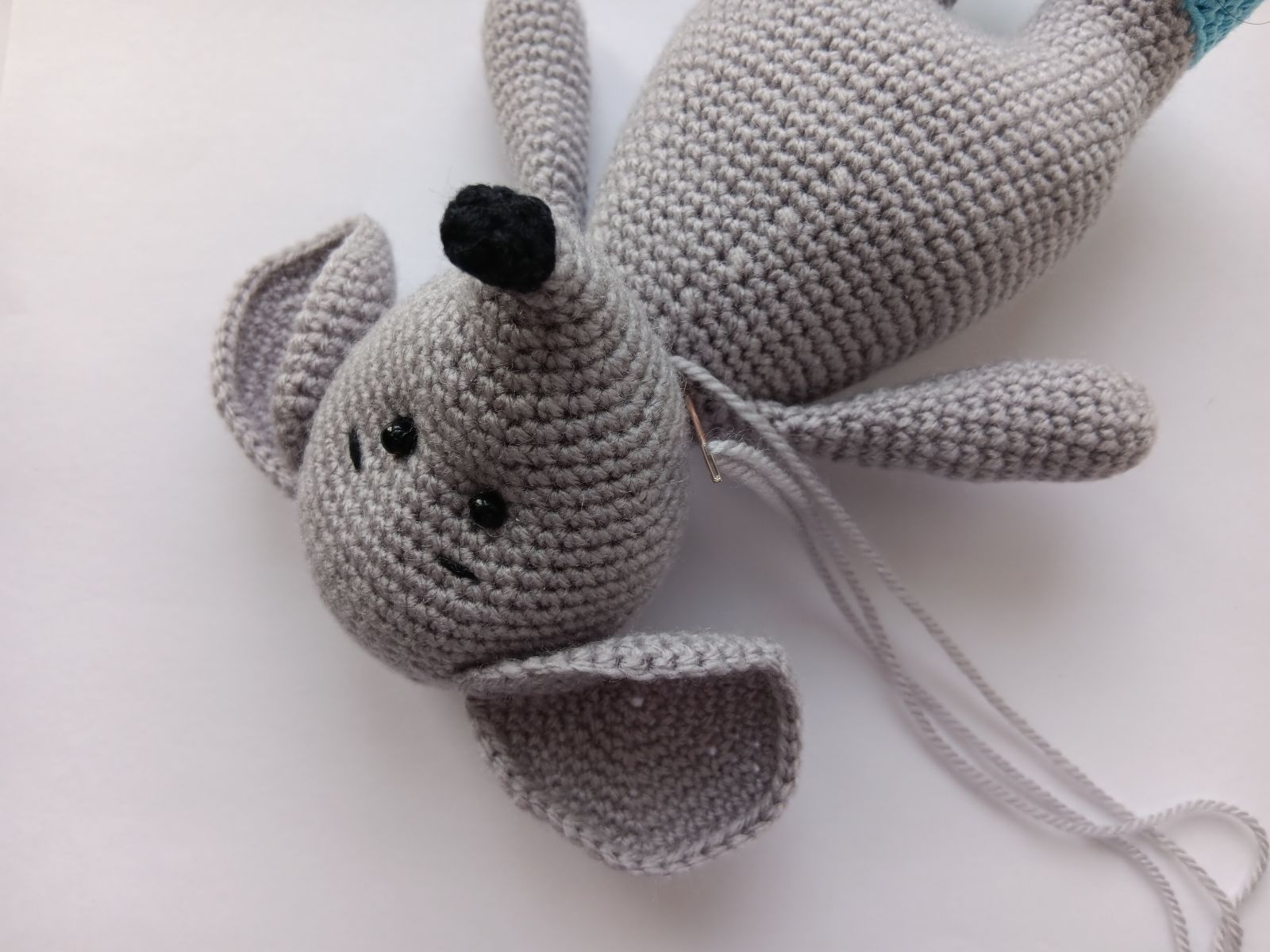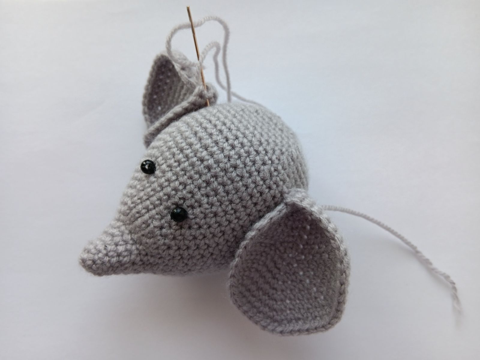 Platziere die Augen oben auf dem Kopf und mit einem Abstand von 4-6 Maschen nähe sie fest. Die Ohren annähen. Das Ohr von beiden Seiten (unten und oben) anzunähen. Das zweite Ohr parallel zum ersten Ohr annähen. Faden vernähen und abschneiden. Fäden im Körper verstecken