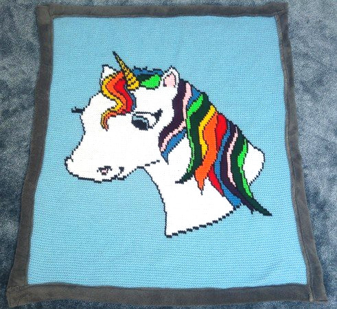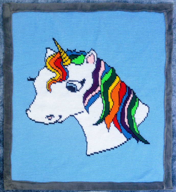 50x50cm breit. Die Anleitung ist einsteigerfreundlich geschrieben und erklärt in einer Schritt für Schritt Anleitung wie man das Motiv arbeitet und den hinteren Teil annäht.