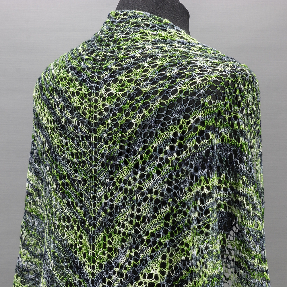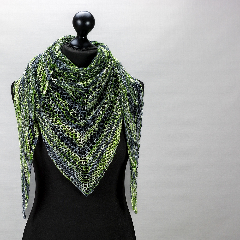 Das Tuch Birkenlicht ist mit seinen verschiedenen Lochmustern abwechslungsreich zu stricken. Da es aus feinem Lace-Garn gestrickt wird, ist es ein federleichtes Tuch, man spürt es kaum, wenn man es trägt.