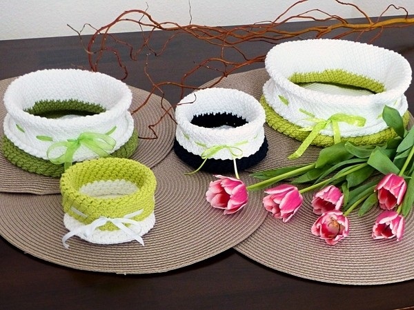 jedes beliebige andere Garn verwenden wie z.B. Wolle - oder sogar Sisal-Bindfaden, wenn ihr die Körbchen vielleicht im Garten aufstellen wollt!