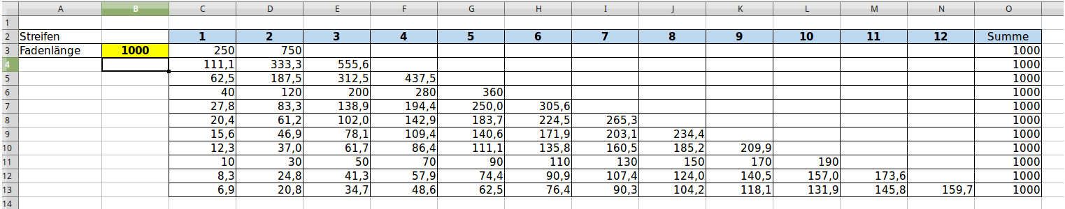 Ich habe eine kleine Excel-Tabelle gemacht, wo man über die Eingabe der Fadenlänge und der gewünschten Streifenanzahl auf die Länge der einzelnen Farben kommt - wenn du magst, schicke ich sie dir gerne zu (muss sie nur noch etwas optimieren....)