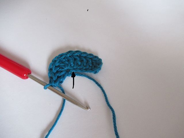 Jetzt bist du am Ende der LM-kette angekommen und musst an der Unterseite der LM-Kette weiter häken (siehe Pfeil): 4 Stb und in die letzte LM 5 fM. In die 2. (Wende)-LM eine KM häkeln. Jetzt hast du 1 Runde gehäkelt.