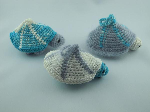 Die langsamen Gesellen werden gehäkelt, mit Wollresten und einer Häkelnadel Nr. 2,5.