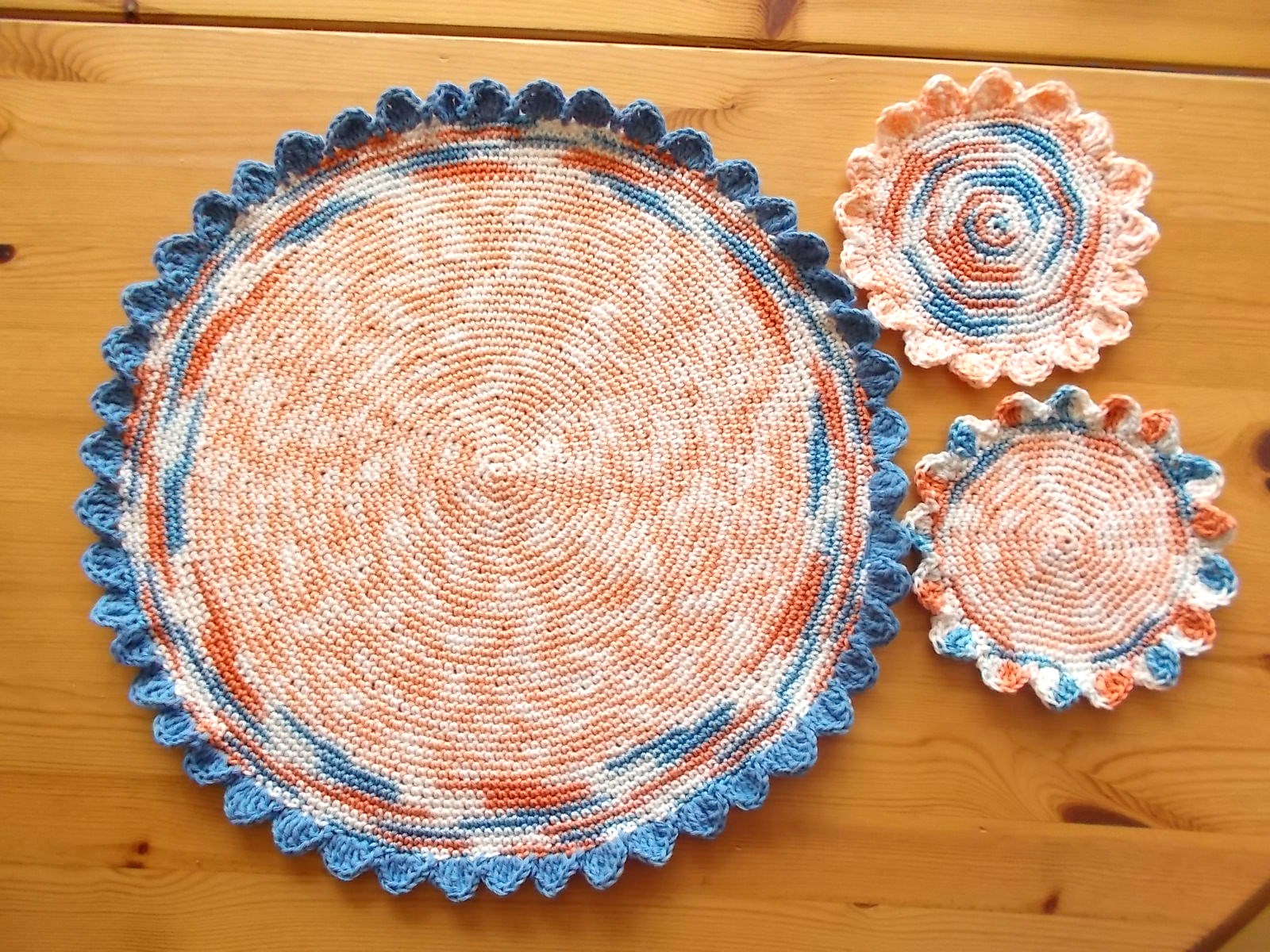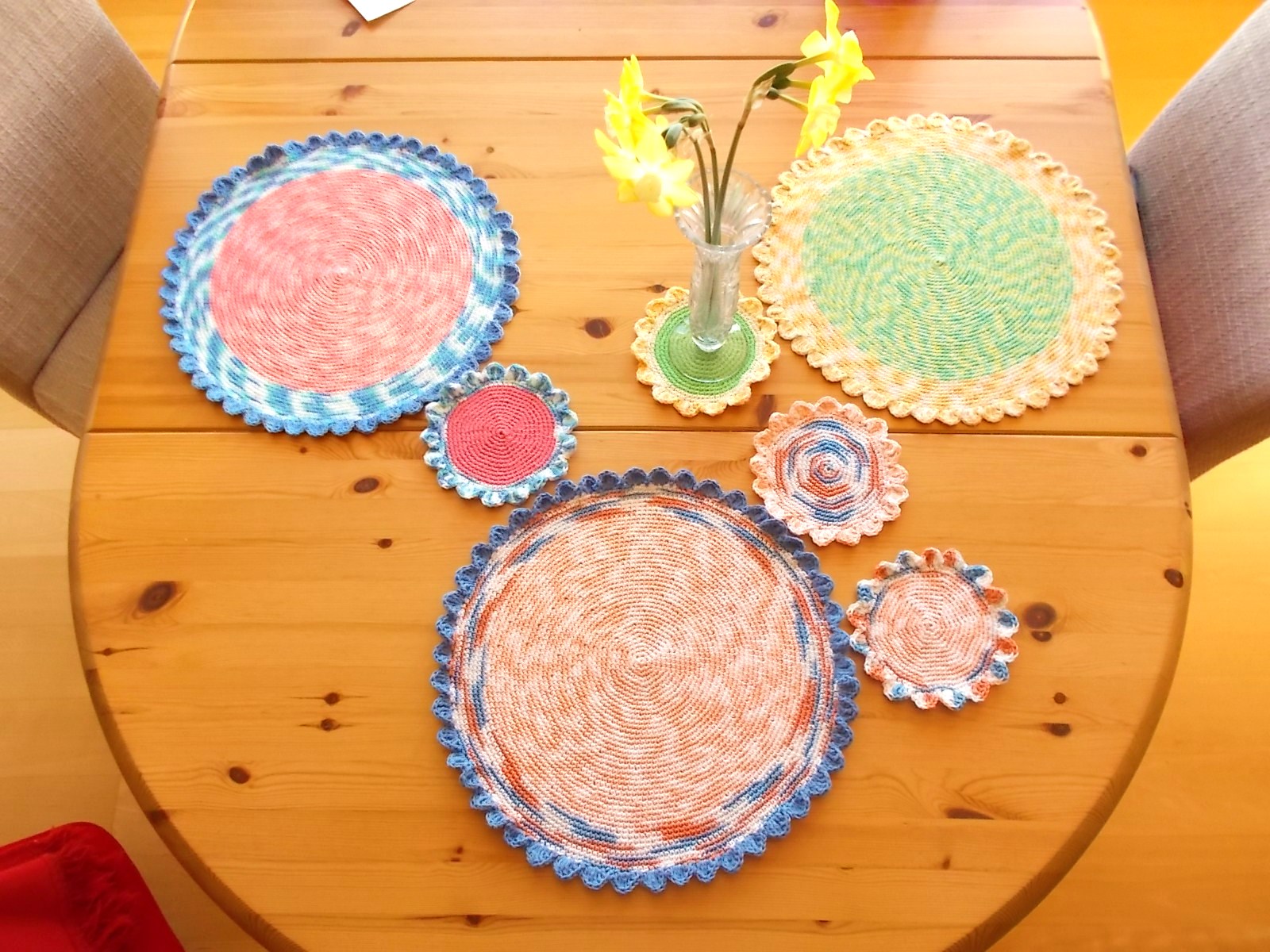 Und das neue Set mit 2 Untersetzern (aus Restwolle) hab ich natürlich bis Ostern fertig gehäkelt. So sieht das jetzt aus - das 2. Foto mit den anderen Sets der Frühlingswiese.