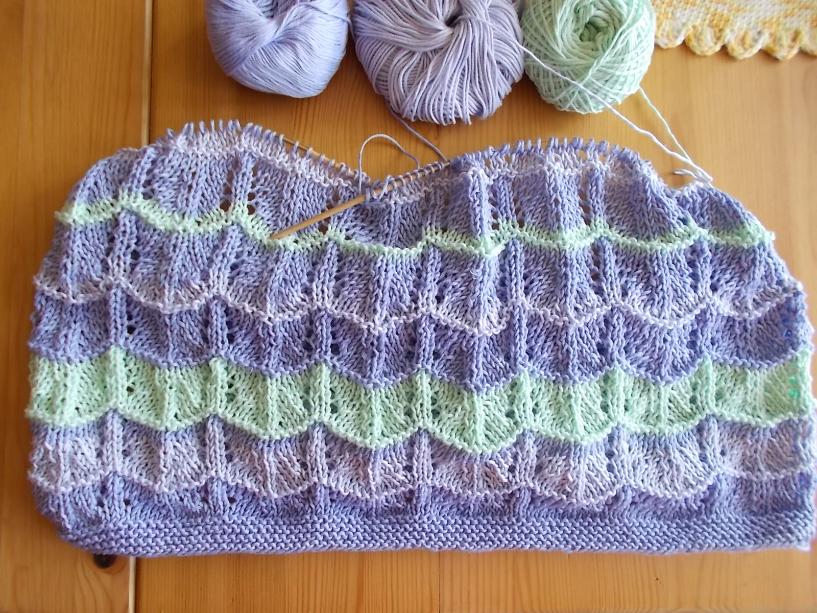 Josefa, diesen Monat hab ich keine Ufos, aaaber ... in den nächsten Monaten sieht das wohl anders aus. Ich hab nämlich zu zwei Projekten momentan überhaupt keine Lust - und hab mit einem dritten begonnen - ein Sommertop für mich. Da hab ich lange verschiedene Muster ausprobiert und endlich das gefunden was mir gefällt. Es ist beim Testen einfach so entstanden. Und nun hab ich schon einige Reihen fertig. Natürlich wird hier Diätwolle verstrickt. So sieht das Top jetzt aus - alles an Ostern gestrickt: