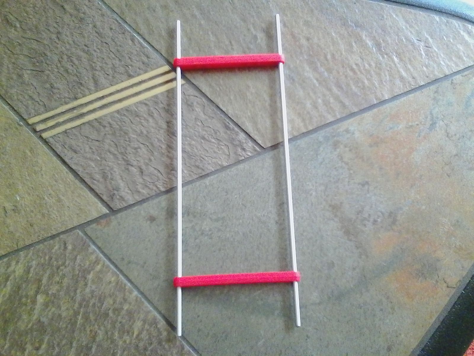 Es ist ca. 10 cm breit und ca. 30cm hoch. Es sind eigentlich nur zwei Nadeln, die mit den roten Teilen verbunden sind.