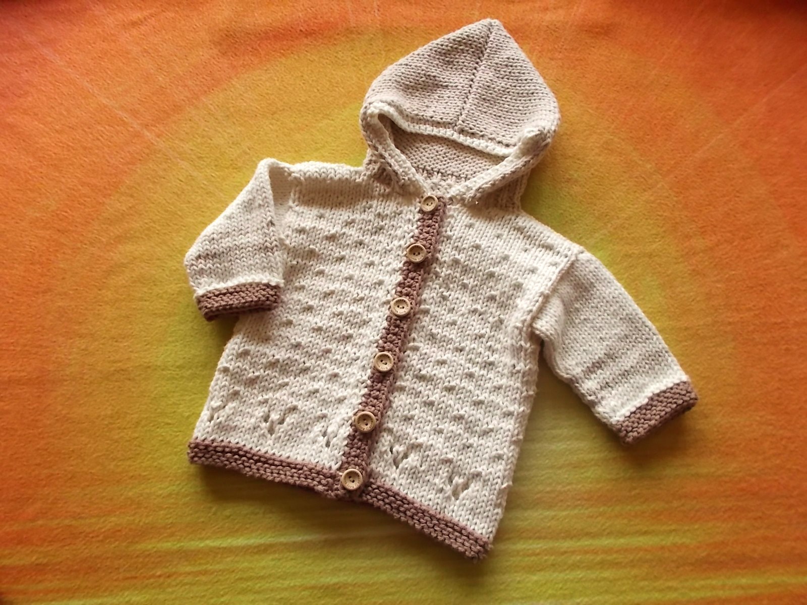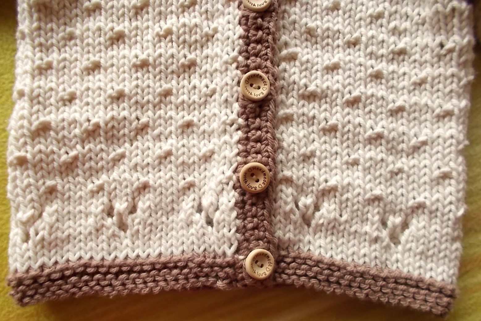 Diese Baby-Erstlingsjacke ist aus Baumwolle gestrickt und ideal an kühleren Tagen im Sommer. Sie passt bis zur Größe 68. Die Jacke erinnert ein wenig an den Trachten-Stil, sie hat ein hübsches Lochmuster eingestrickt.