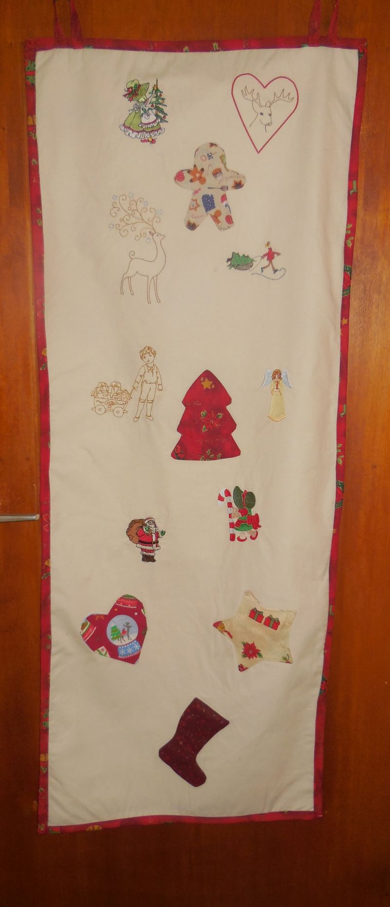 der weihnachtliche Türbehang ist ein gutes Beispiel wie man beides mischen kann. Diesen Behang hab ich auf Wunsch meiner einen Enkeltochter gemacht, sie hat bestimmt was wohin kommt und wie es auszusehen hatte. :-)  Das Herz mit dem Hirschkopf, der Hirsch mit dem geschwungegenem Geweih, so wie der Junge mit dem Schlitten sind eigene digitalisierte Muster von mir, die Apllis sind auch von mir, die anderen Muster mal irgendwoher aus dem www als Freebie runtergeladen