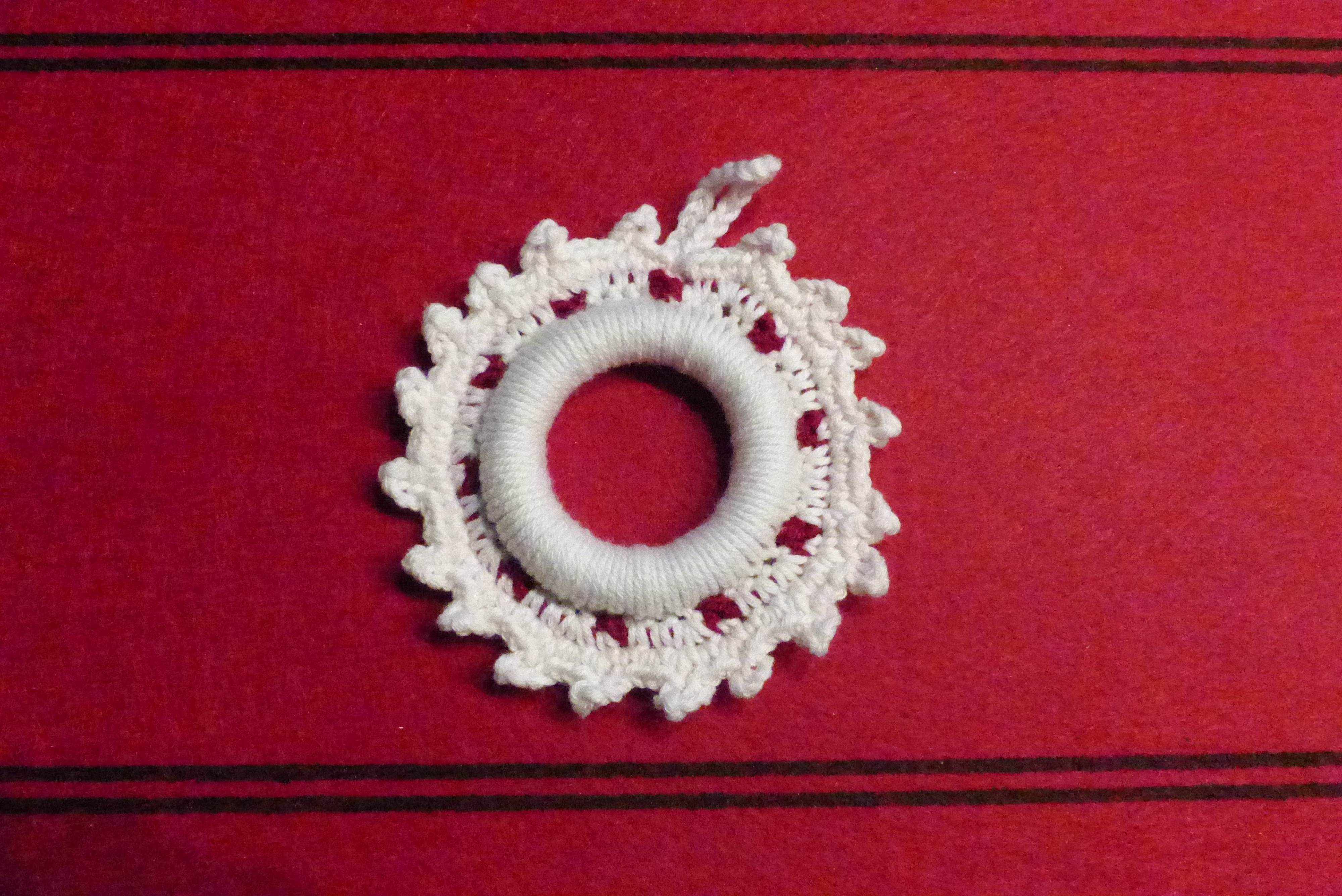 Ich habe schon einmal einen Ring von meinen Gardinen (gab es früher mal, Eiche rustikal) umhäkelt, für einen Weihnachtsanhänger.