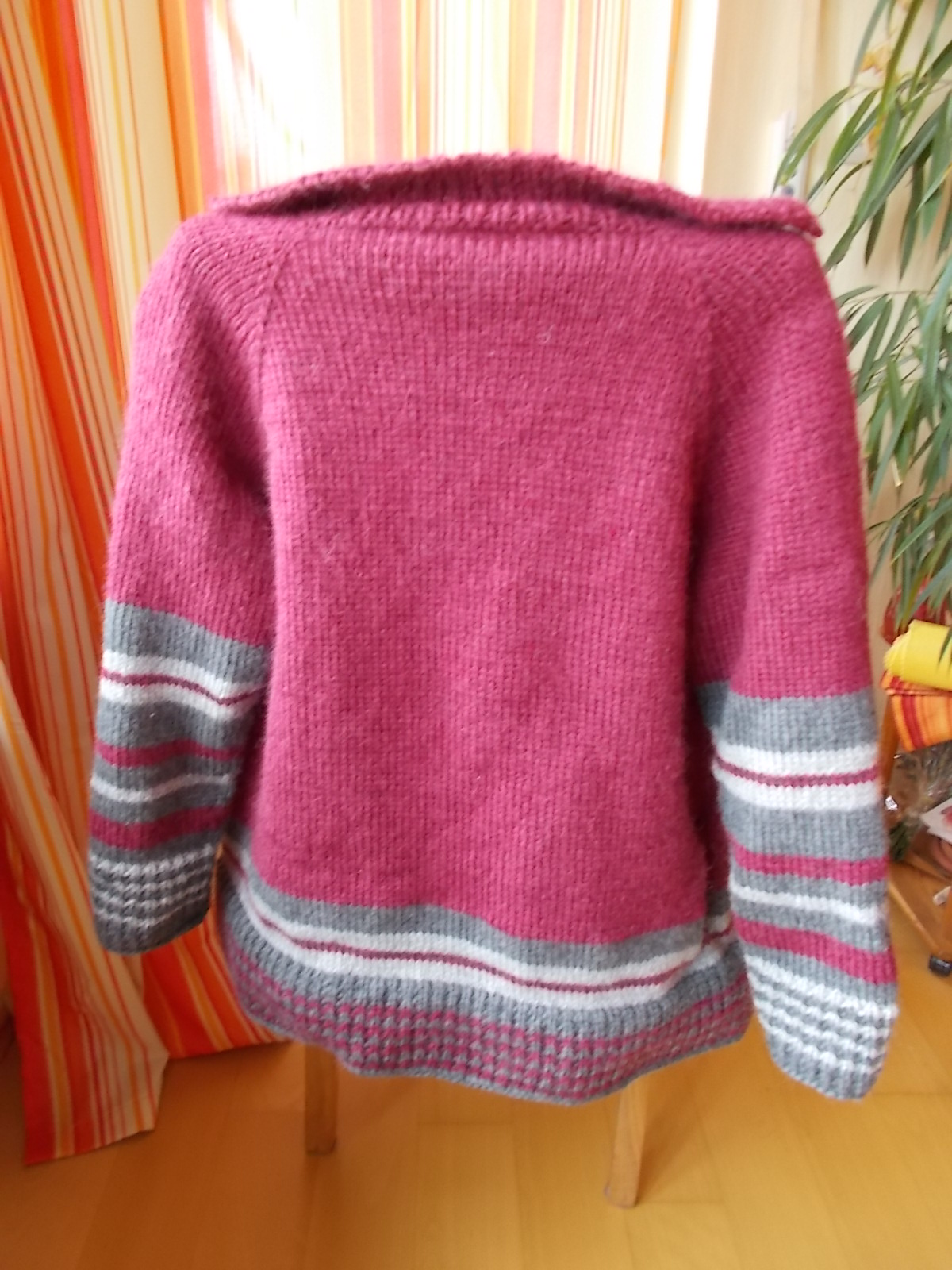 Ina, die Farben von der Jacke kommen hier auf dem Foto überhaupt nicht richtig raus. Sie ist weinrot, also ziemlich dunkel. Unten sind dunkelgrau und hellgrau in den Streifen.