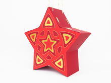 Dieser Stern ist aus Fotokarton gefertigt und ca. 26,5 x 25 x 9,5 cm groß. Mit etwas Bastelerfahrung lässt sie diese Geschenkverpackung sehr leicht nacharbeiten.