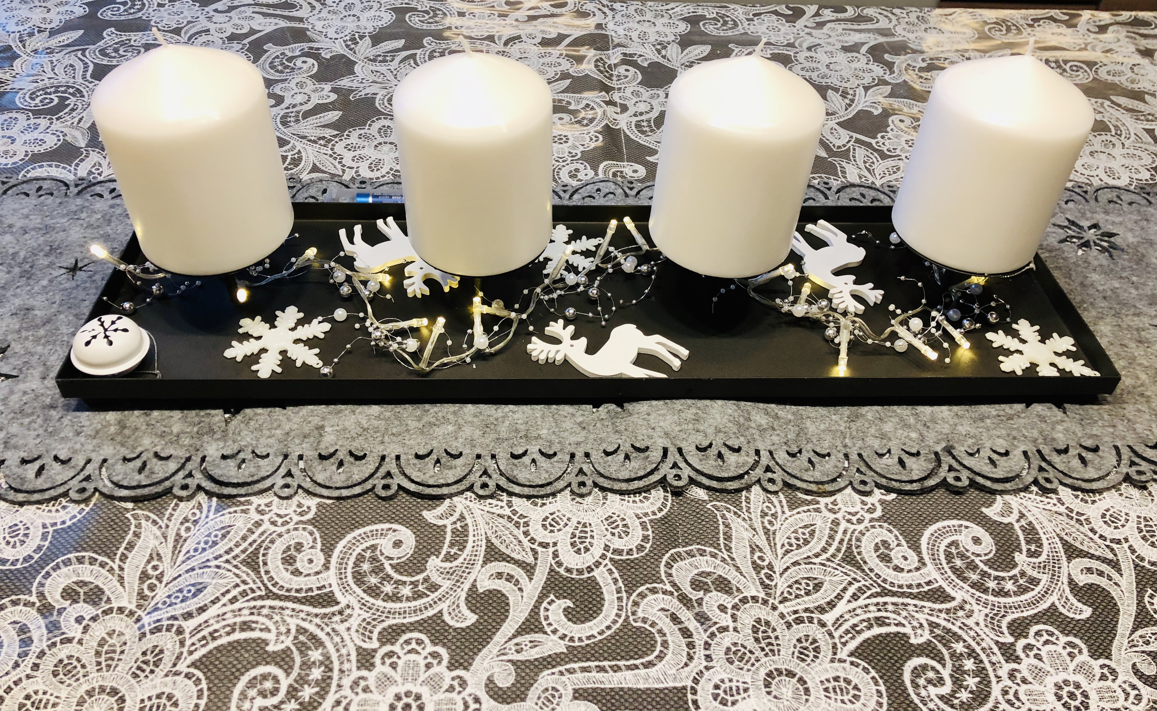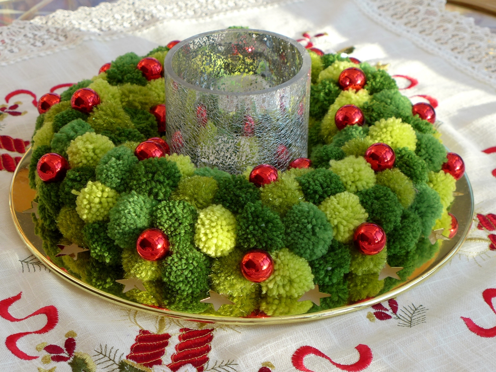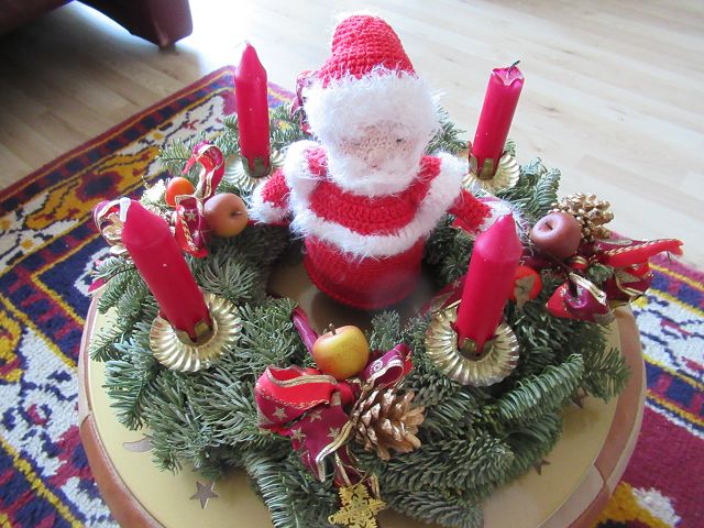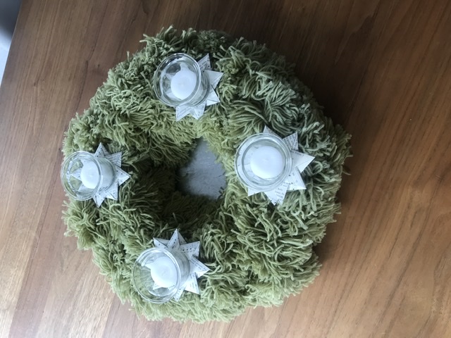 In diesem Jahr gibt es bei uns keinen echten Adventskranz, weil auf dem Tisch im Wintergarten lieber der selbstgemachte aus Bommeln stehen wollte. Nadelt auf jeden Fall nicht und ist schnell weggeräumt, wenn man den Tisch braucht. Ist natürlich nur eine Kerze, die leuchtet.
