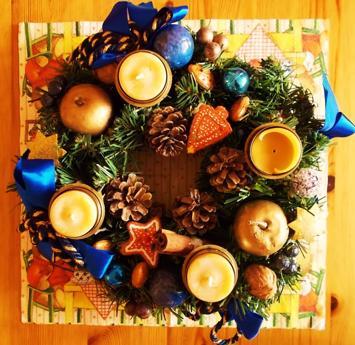 Zur Bereicherung dieses Adventskranz-Threads zeige ich Euch noch meinen selbstgemachten von 2016, den ich aus verschiedenen Nadelgehölzen gesteckt habe. Alles, was ich in meinem und Nachbars Garten an Grünzeug gefunden habe, wurde mit eingesteckt. Die Tannenzapfen habe ich im Wald gesammelt und an den Rändern mit Glitter aus der Tube bemalt. Am Ende war er so ausladend, dass er auf dem Gartentisch draußen vor dem Küchenfenster bleiben musste und nur an den Adventssonntagen hereingeholt wurde.
