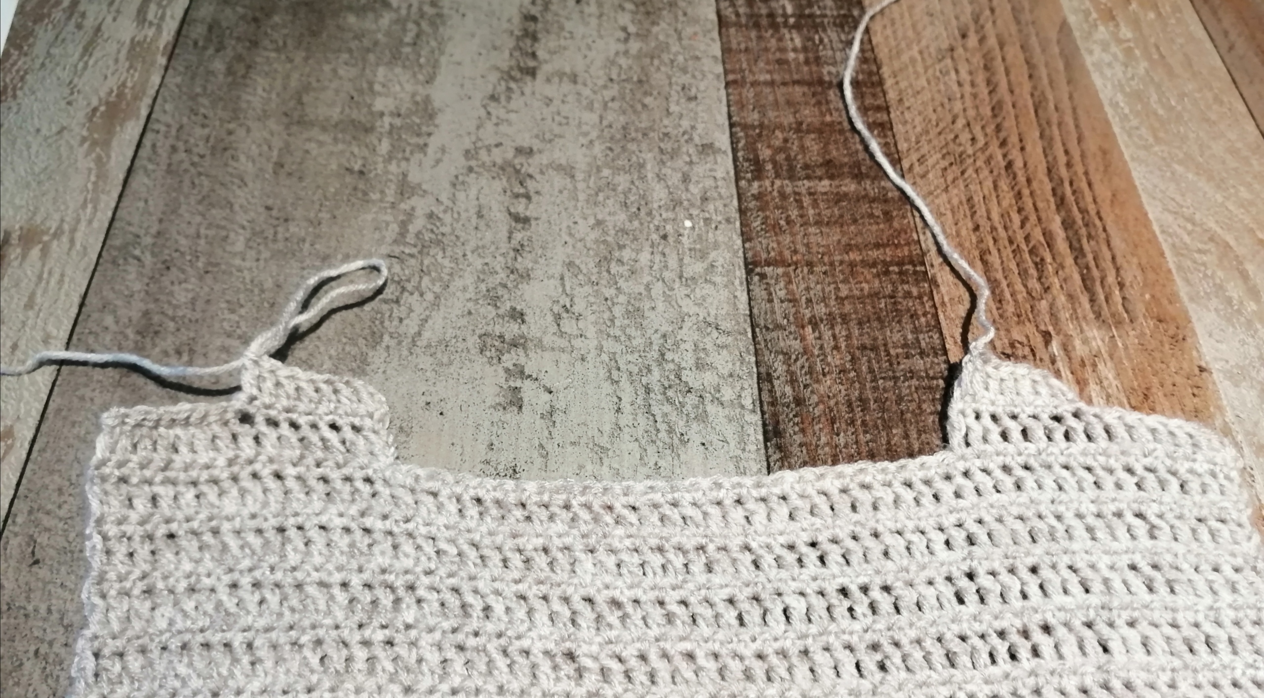 Ich habe 54 Lm angeschlagen, 15 cm Gesamthöhe für Armausschnitt gewählt, dann weiter gehäkelt bis ich bei 27cm Gesamthöhe war. Das Muster ist übrigens eine Reihe Stäbchen, eine Reihe feste Maschen.