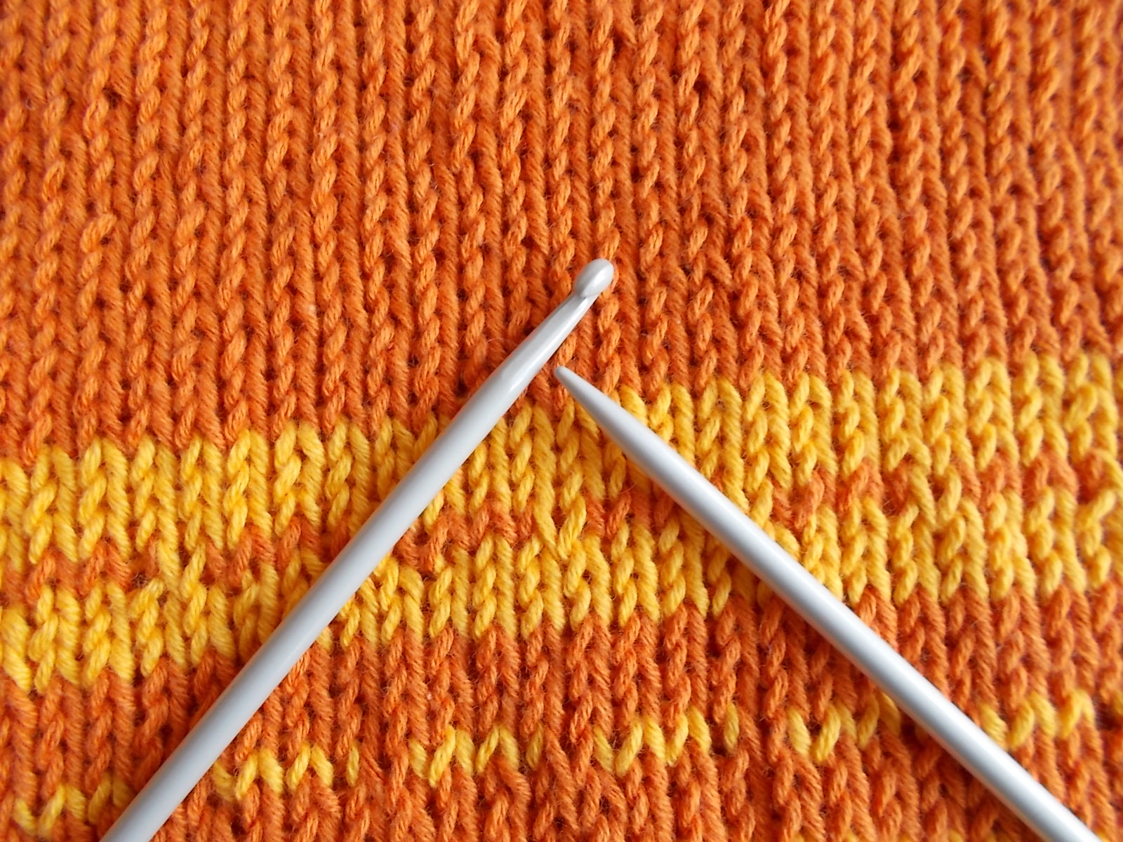 Wenn ich am Ärmel oder am Hals beim Stricken Maschen aufnehmen muss, nehme ich mir eine Nadel zu Hilfe, die an einem Ende eine Häkelnadel ist, am anderen Ende eine Stricknadel. So lassen sich die Maschen leichter aufnehmen und später einfach auf die Stricknadel schieben.