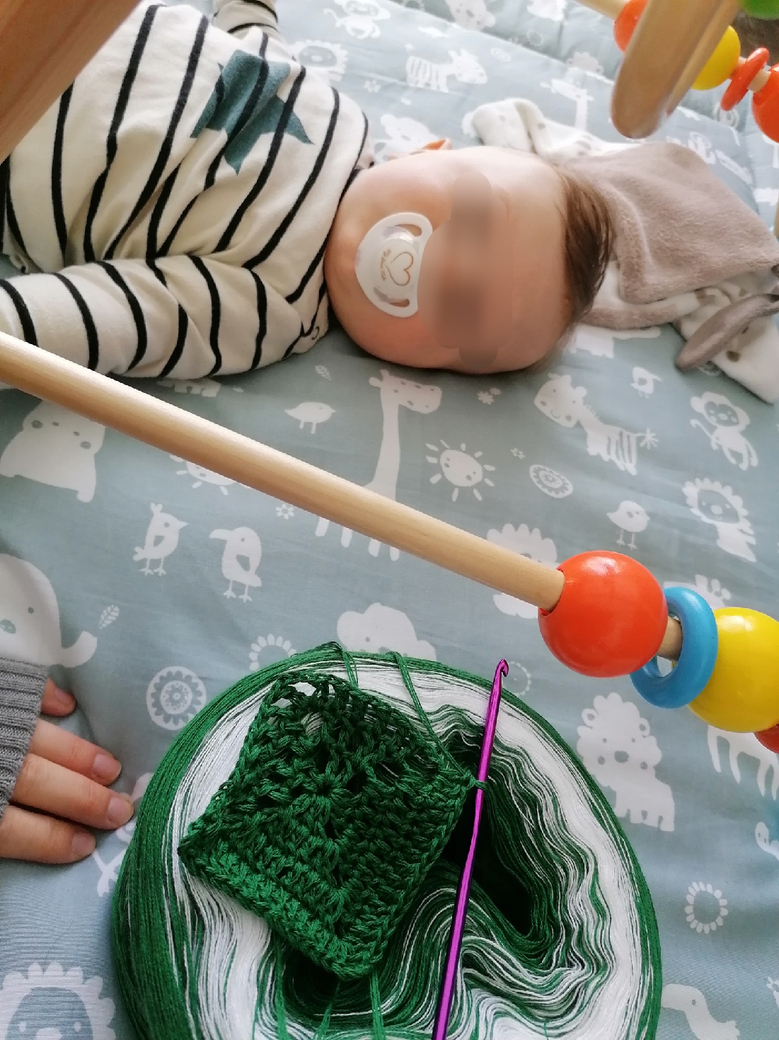 Ich habe nun angefangen, mit Leo auf den Boden zu sitzen und da zu häkeln, während er spielt - auch eine Option.