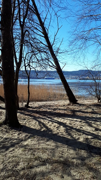 herrlicher Sonnenschein heute, da mussten wir einfach mal raus. Spaziergang zum Drammen-Fjord, nur 20 min Fußweg von uns.