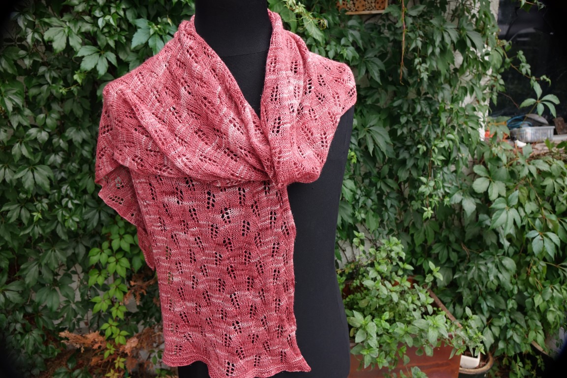 PaYaLa ist ein leichter Sommerschal aus nur 100g Lacewolle mit 800m auf 100g, er kann aber mit doppelter Menger doppelt so groß gestrickt werden und kann dann als Stola getragen werden.