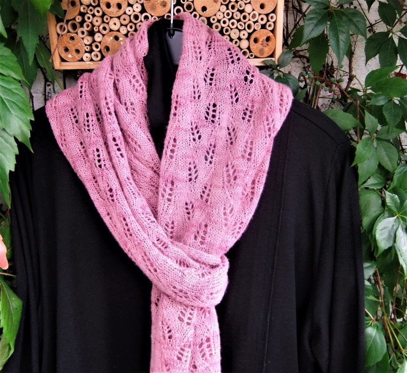Ein schönes Muster entsteht hier durch Umschläge, rechte und linke Maschen sowie das zusammenstricken von Maschen.