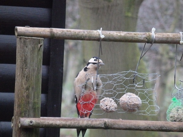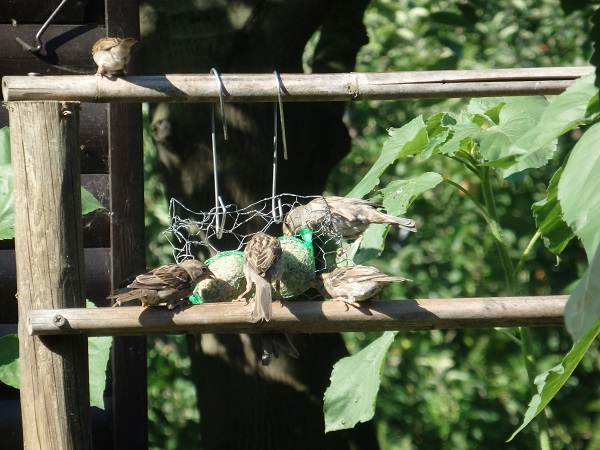 Nun sind die Spatzen aber ja nicht dumm. Im nächsten "Angriff" hat ein Teil den Specht abgelenkt und die anderen konnten futtern. Dann wurde gewechselt.