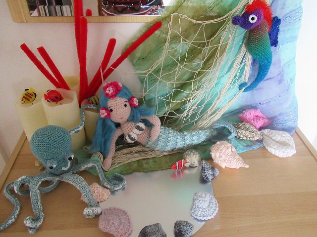Die Landschaft kannst du mit blauen Tüchern, Spiegelfolien, Netzen, Chenilledraht (für die Korallen) und Muscheln dekorieren. Und wenn du keine echten Muscheln hast, findest du die Anleitung für gehäkelte Muscheln ebenfalls in meinem Shop.