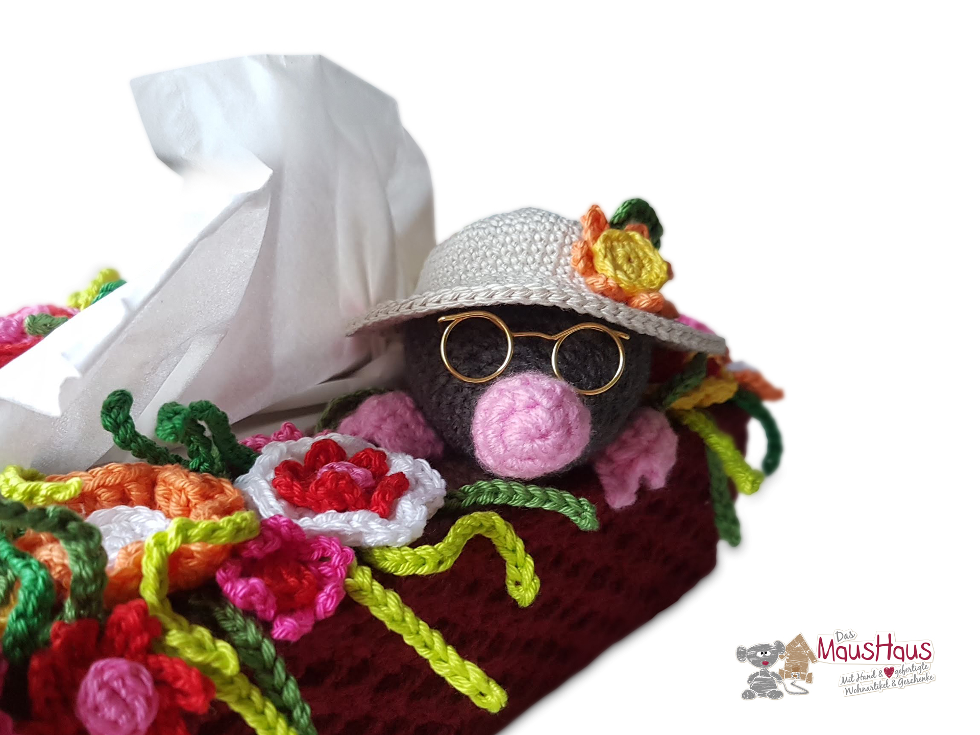 Schnöde Taschentücher Boxen waren gestern! Holt euch den Sommer in's Haus und häkelt euch einen Überzug für eine handelsübliche Taschentücher Box! Pflanzt euch bunte Blumen (gehäkelt aus Wollresten) in euren gehäkelten Blumenkasten und schafft Platz für den kleinen Maulwurf... 😁😁😁