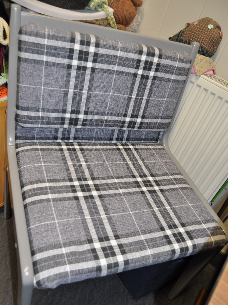 das haben wir heute gemacht, endlich unsere Stühle neu bezogen, das ist die kleine Bank von der ehemaligen Eckbank, das lange Teil haben wir entsorgt, ebenso wie die Ecke, frisst zuviel Platz