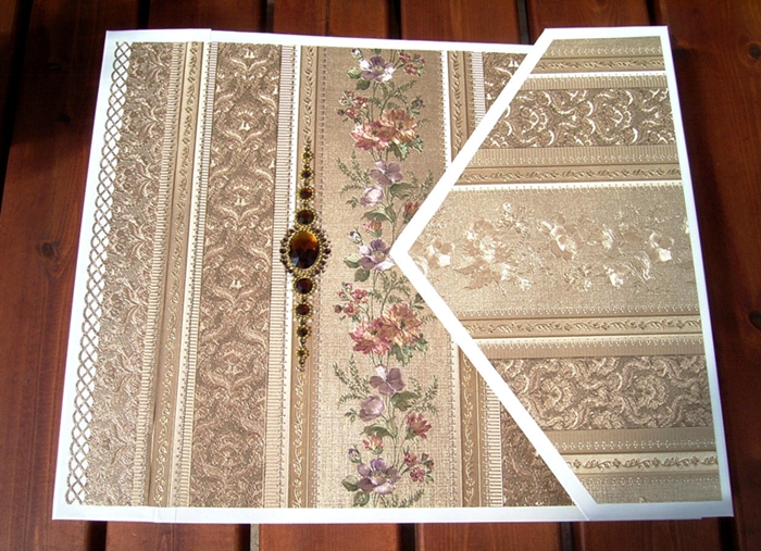 Das aufklappbare Album war ein stabiler weißer Rohling mit Heftmechanik. Den habe ich zuerst rundherum mit weißer abwaschbarer Folie beklebt. Innen habe ich gemusterte Folie auf den Rohling geklebt. Dann kam die Gestaltung: außen mit Tapete aus einem Tapetenmusterbuch, der linke Rand wurde gestanzt.