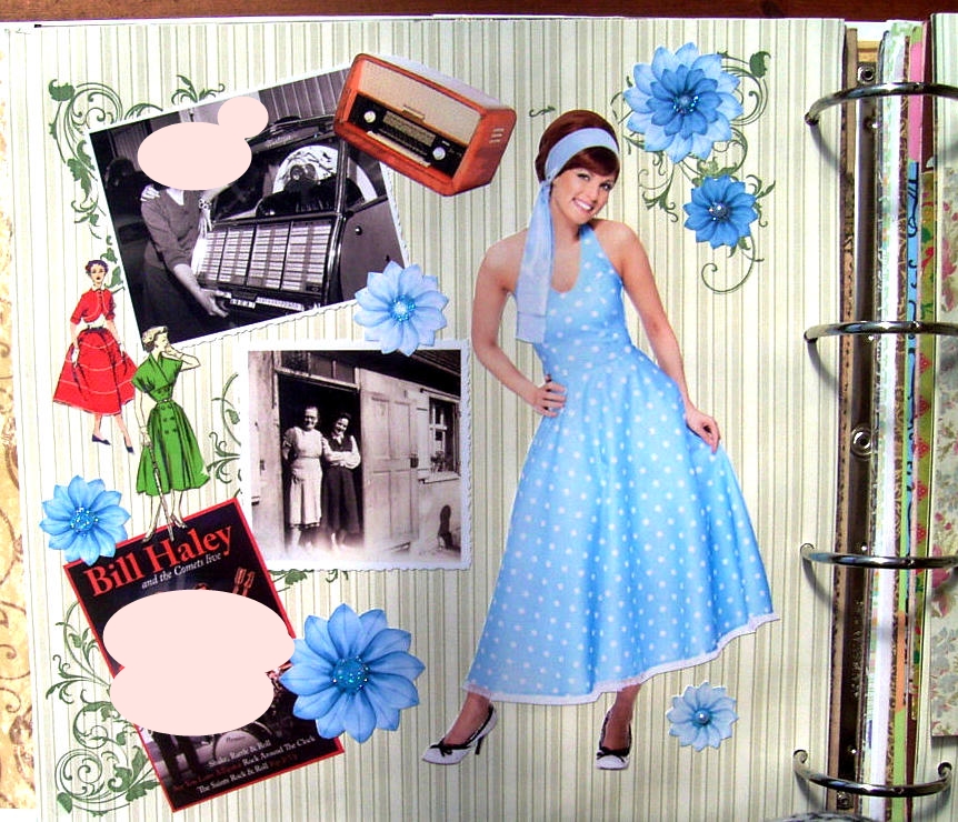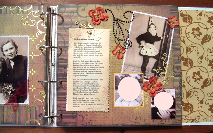 Hier mal ein Beispiel von mir. Ich habe für meine Mutti ein persönliches Foto-Erinnerungsalbum zu ihrem 70. Geburtstag gebastelt. Grundlage waren Fotos aus ihrem Leben, die ich dann mit anderen Sachen aus der Zeit in Szene gesetzt habe. Die schönsten darf ich Euch aus Urheberrechtsgründen leider nicht zeigen. Aber wir haben einfach die verschiedenen Jahrzehnte nochmal aufleben lassen. Sie bekam dazu einen Präsentkorb mit all den Sachen, die sie von früher kannte und die man noch beschaffen konnte.