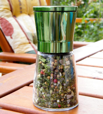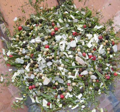 4. Die zerbröselten Kräuter mit grobem Meersalz und buntem Pfeffer (ggf. Chili) vermischen